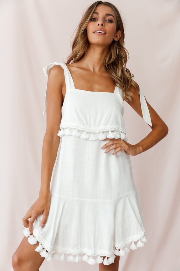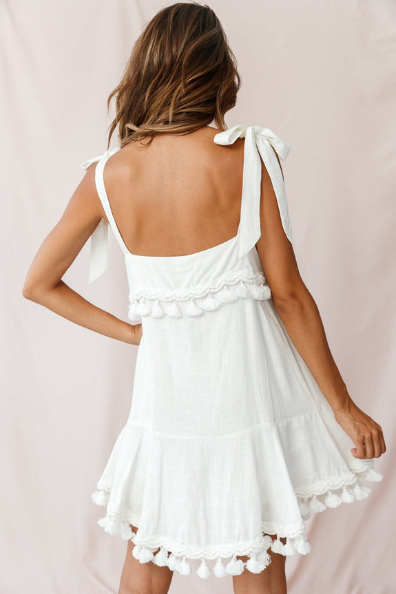 Sirocco Tassel Trim Tied Shoulder Dress White