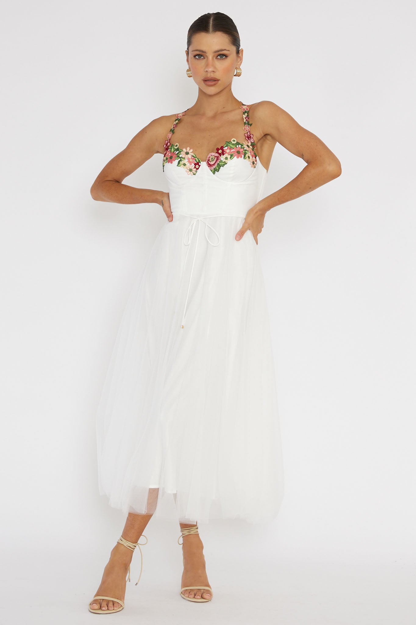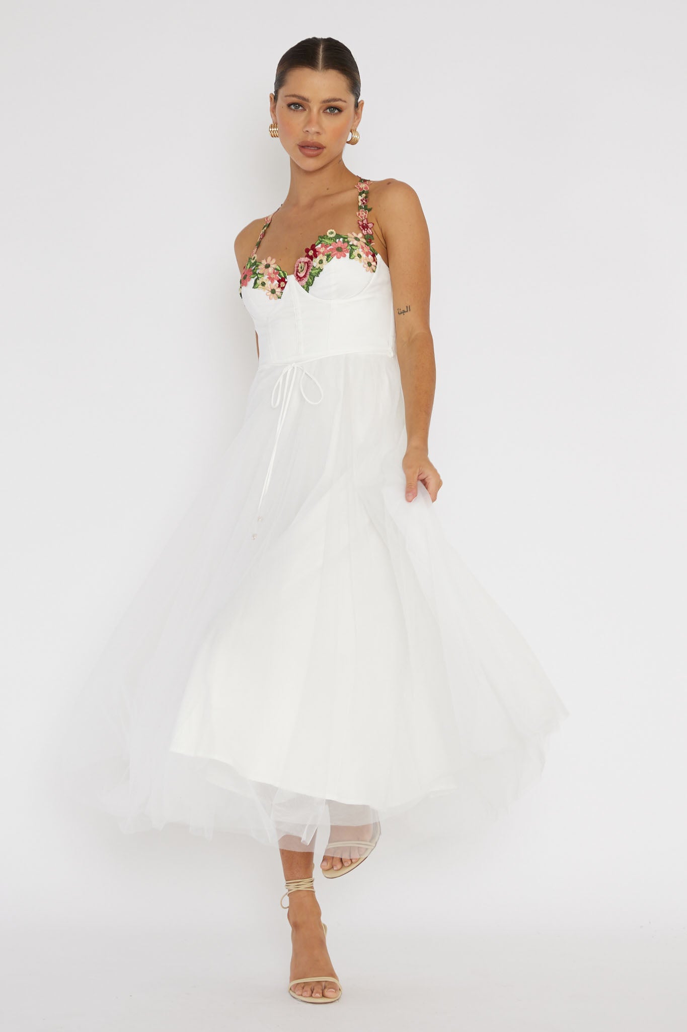 Smitten Sweetheart Neckline Floral Trim Dress White