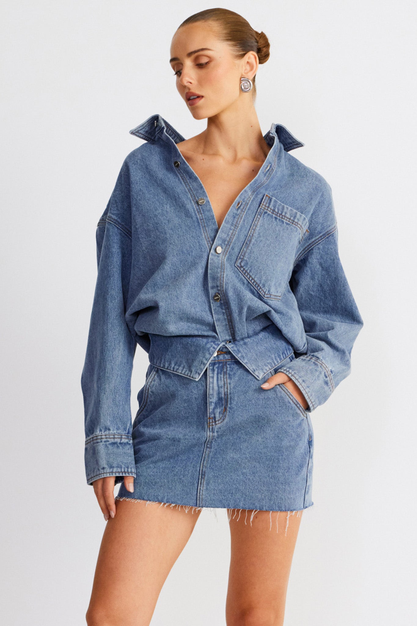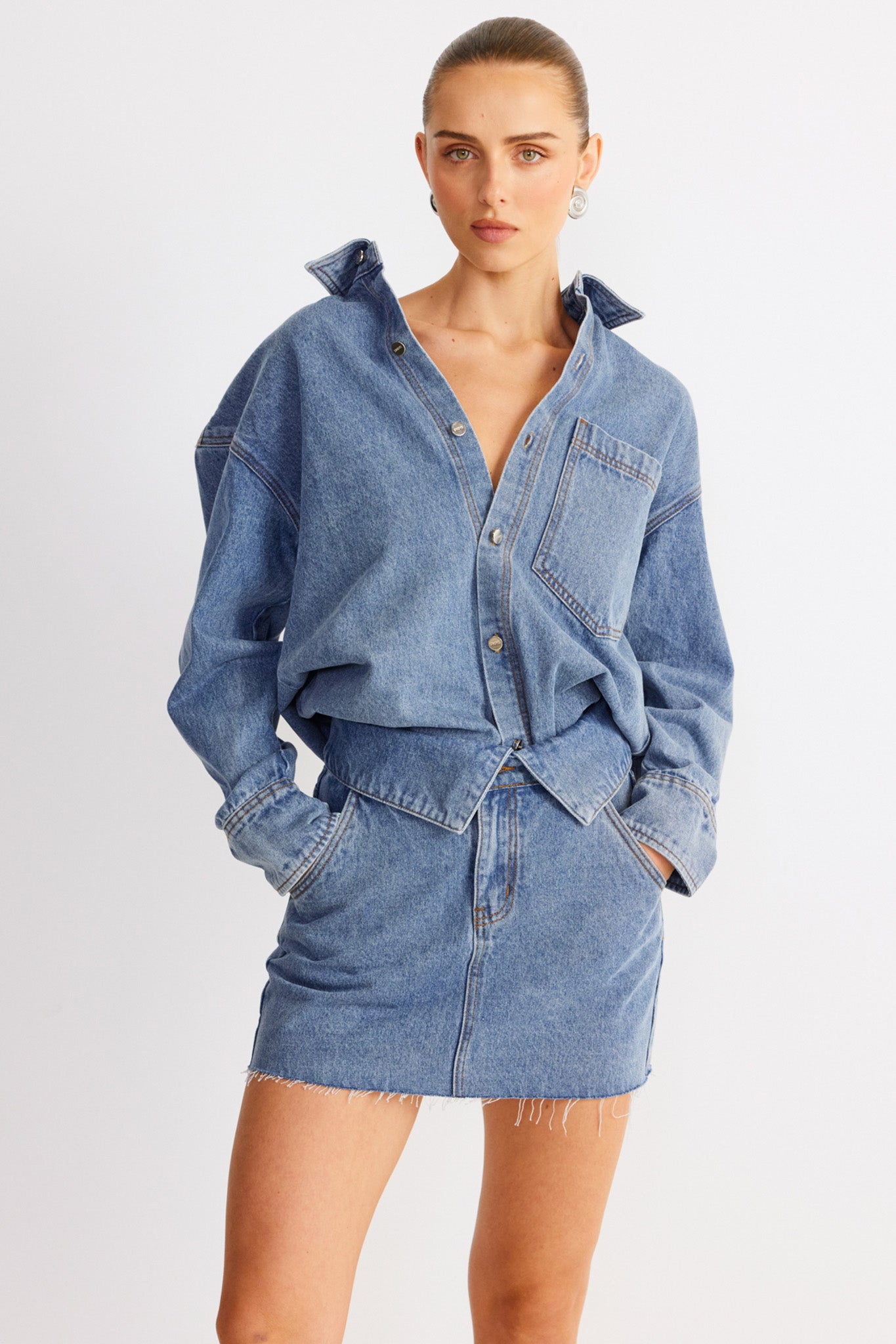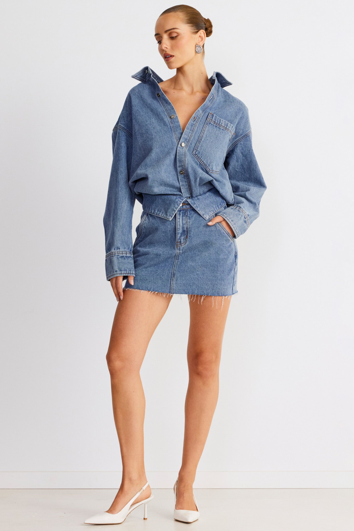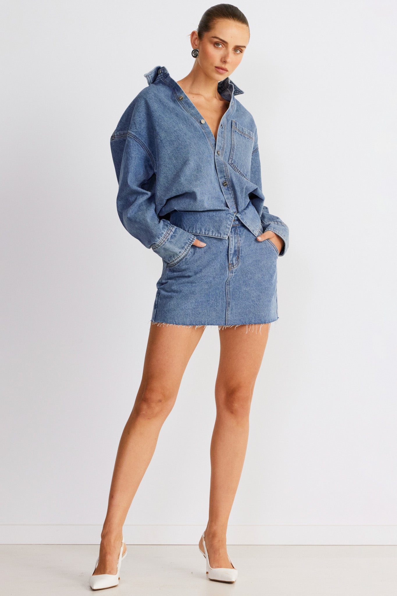 Designed to be a staple in your wardrobe, SNDYS' Eve Denim Skirt offers timeless and versatile charm. Its mini length and denim fabric makes it perfect for both daytime outings and evening adventures. It features a raw hemline that adds a touch of edge to your look. Pair it with the matching shirt or mix and match to always stay on trend.