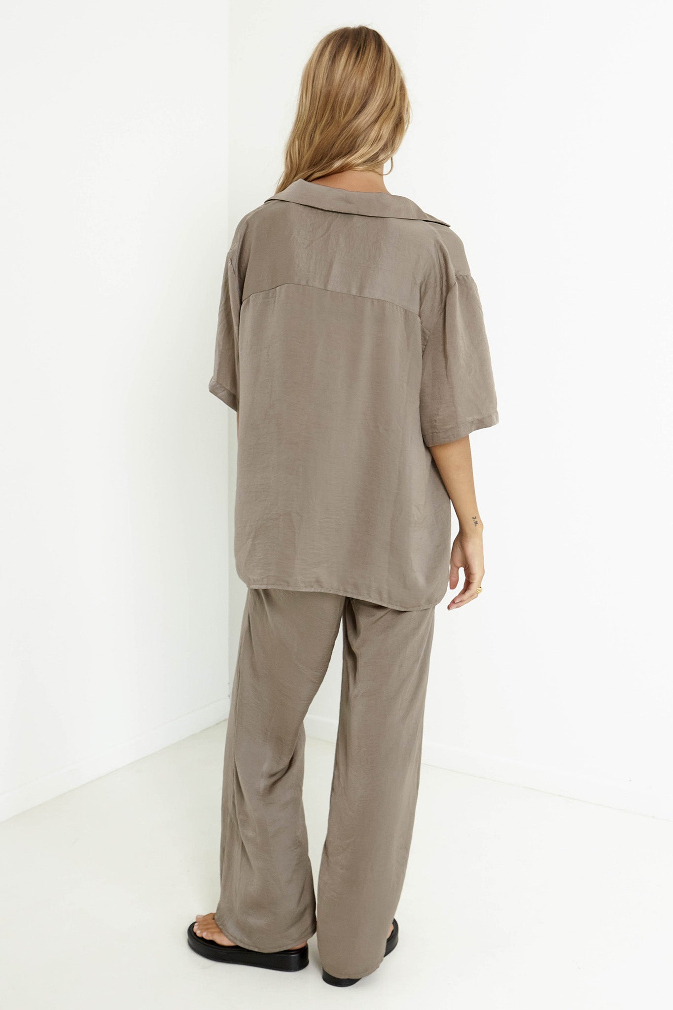The ultimate day-to-night outfit, the Hallie shirt by SNDYS can be dressed up or down. Team it with the Hallie pant, heels and gold, statement earrings for cocktails with the girls or dressed down for Sundays strolling the markets. It features a satin-like material and a loose fit.
