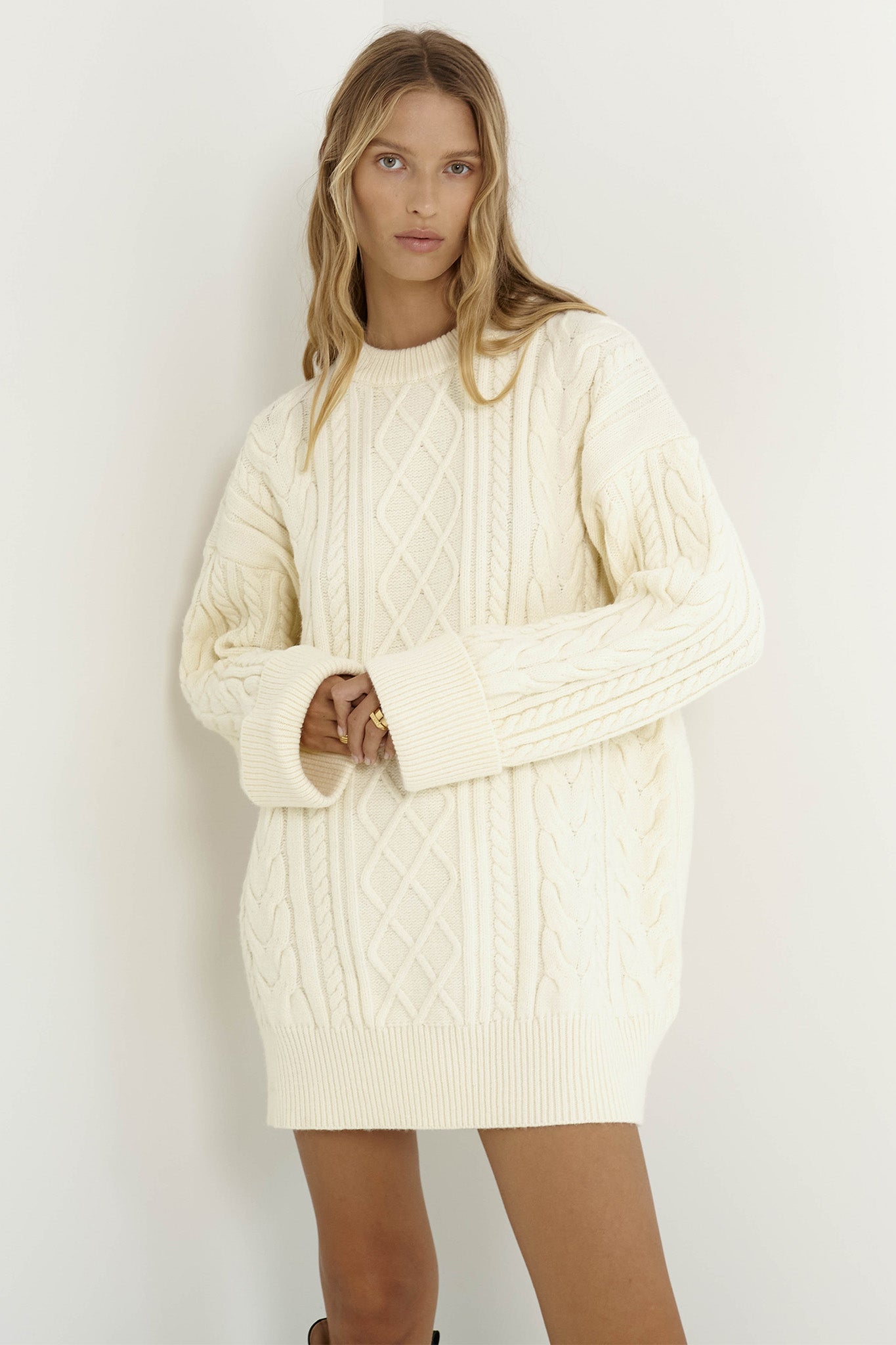 Snuggle up in the must-have Nellie jumper by SNDYS. Featuring a cozy, thick cable knit and large, ribbed cuffs. It's perfect for running errands in style, teamed with bike shorts, socks and sneakers for an effortless, on-the-go look.