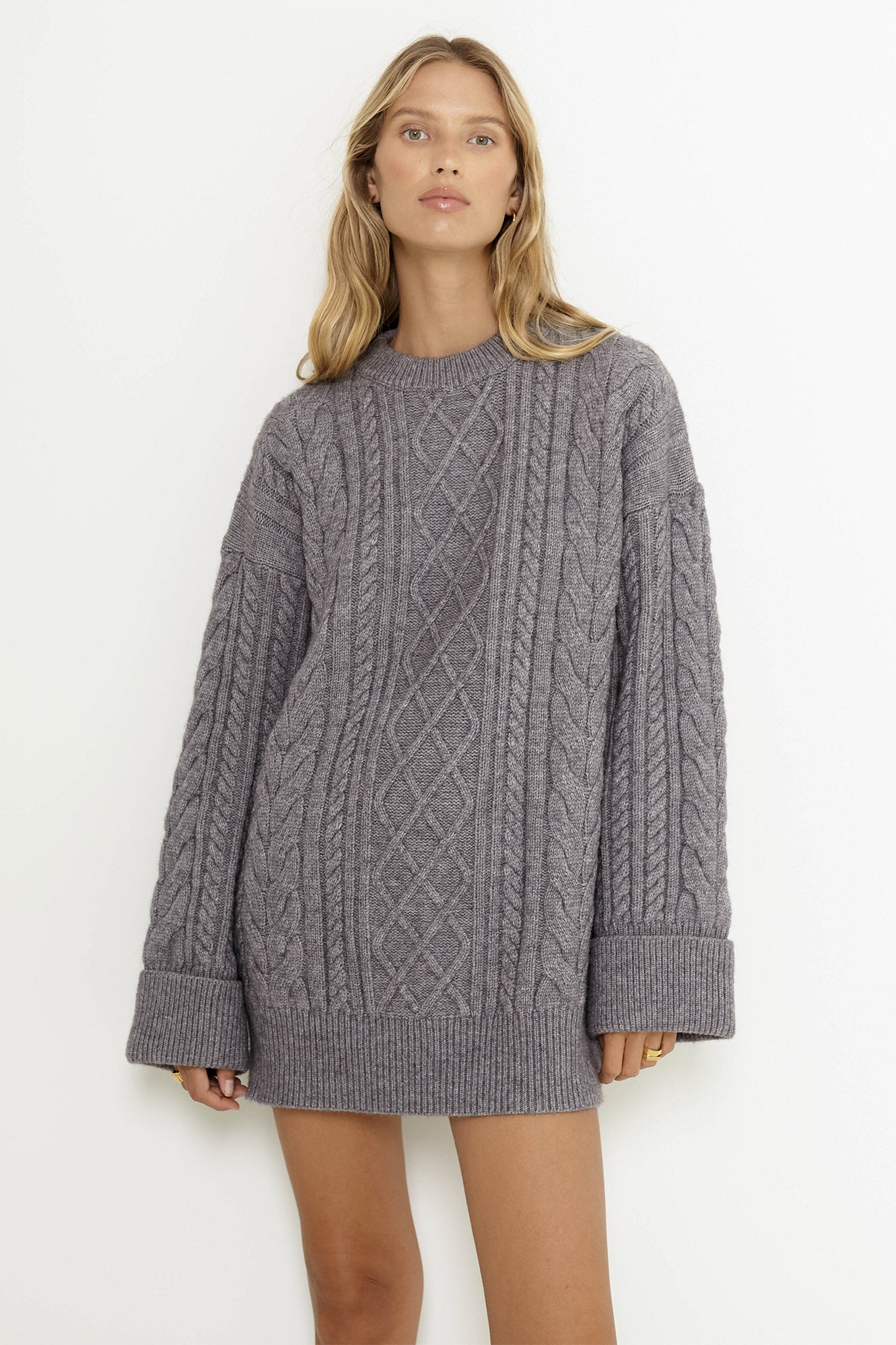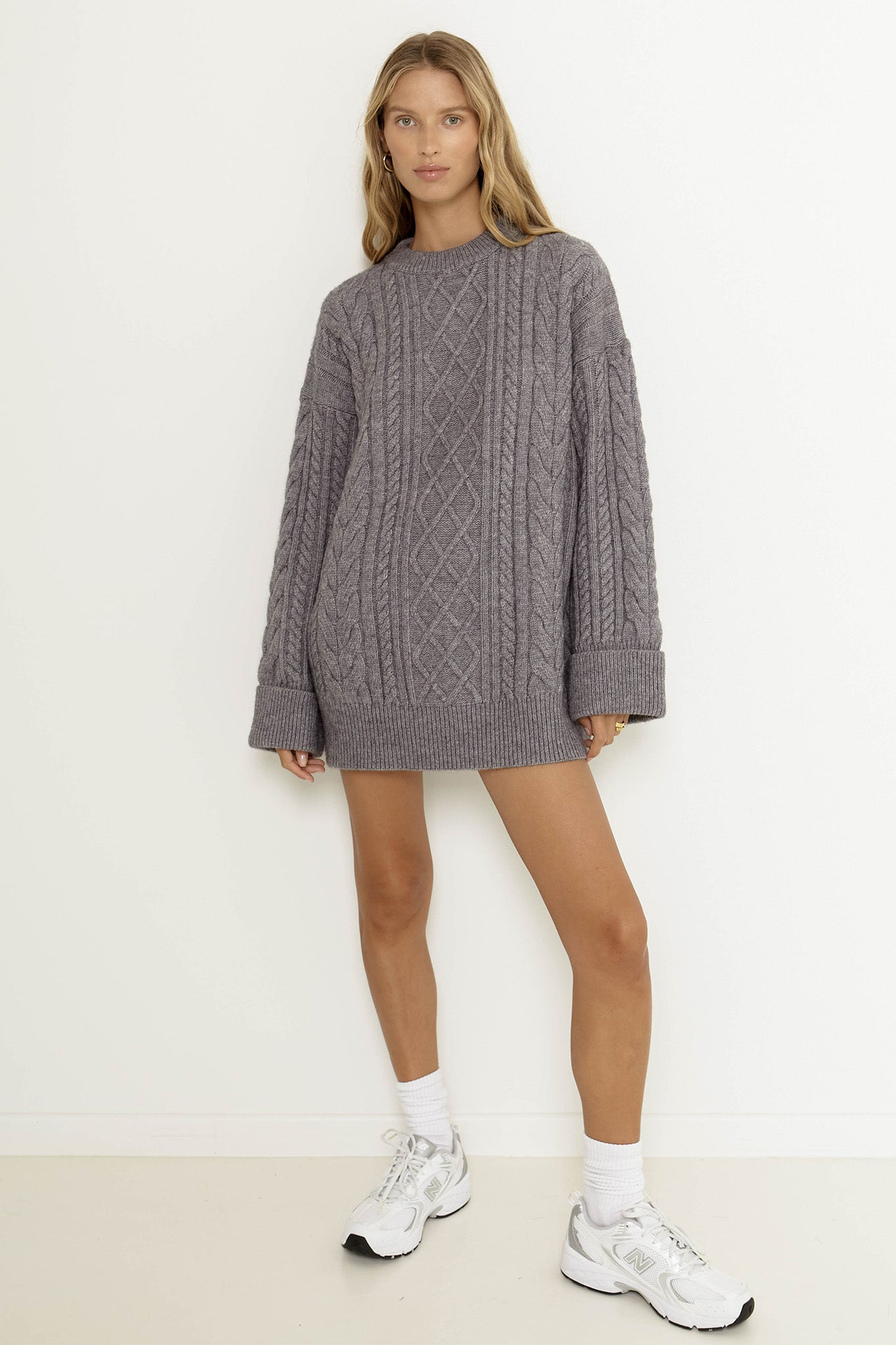 Snuggle up in the must-have Nellie jumper by SNDYS. Featuring a cozy, thick cable knit and large, ribbed cuffs. It's perfect for running errands in style, teamed with bike shorts, socks and sneakers for an effortless, on-the-go look.
