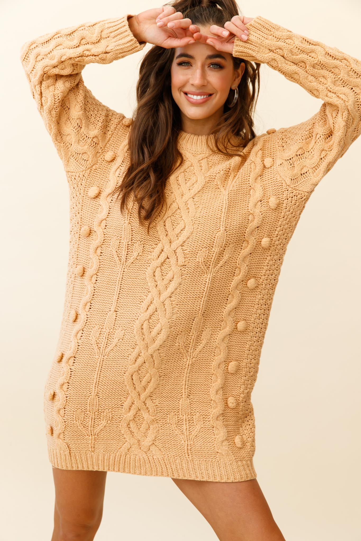 You'll look like the dreamiest snow bunny in our cozy Snowstorm sweater dress. We are loving the chunky cable knit and adorable pom pom details. Perfect for cozying up by the fire teamed with tights and over-the-knee boots.