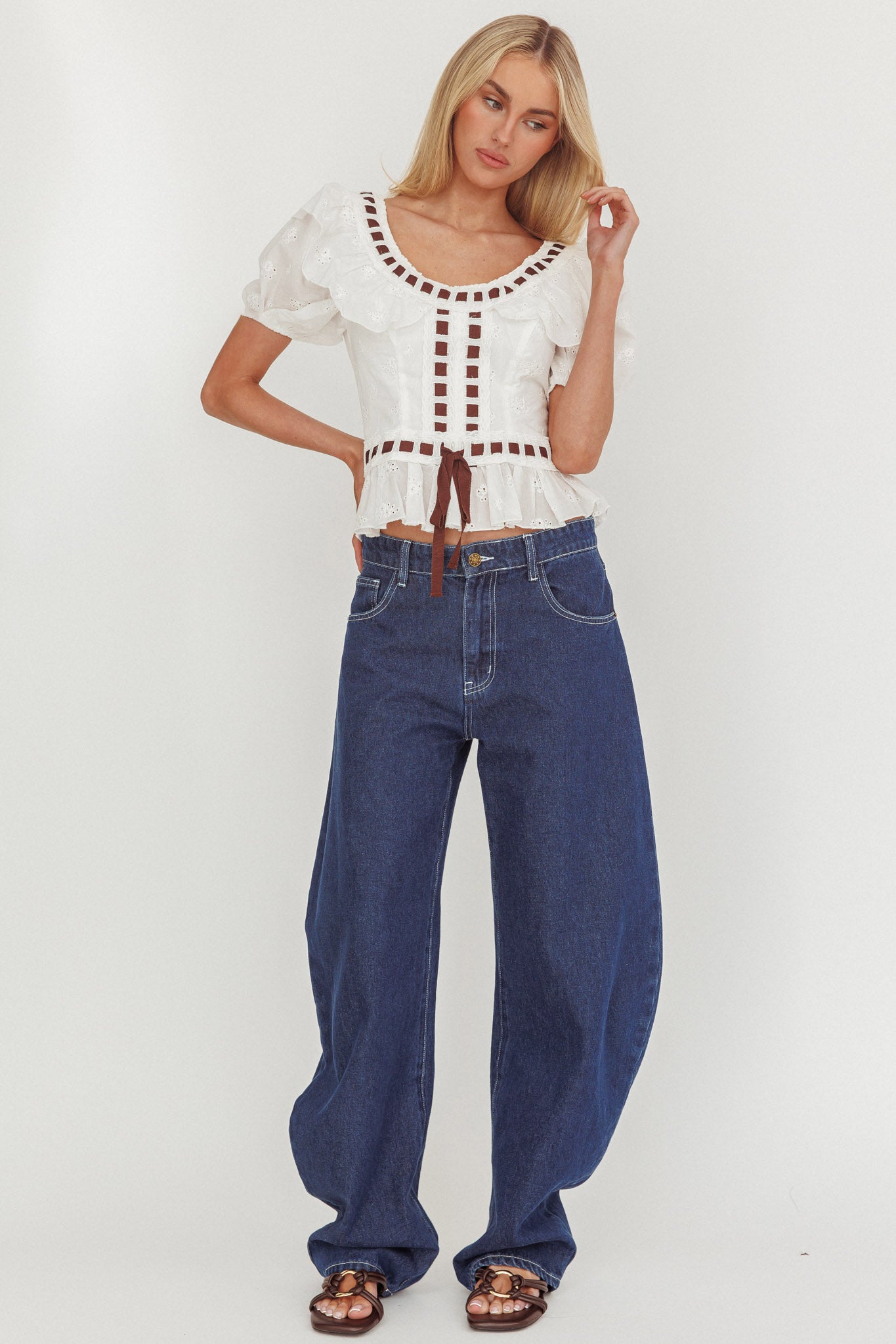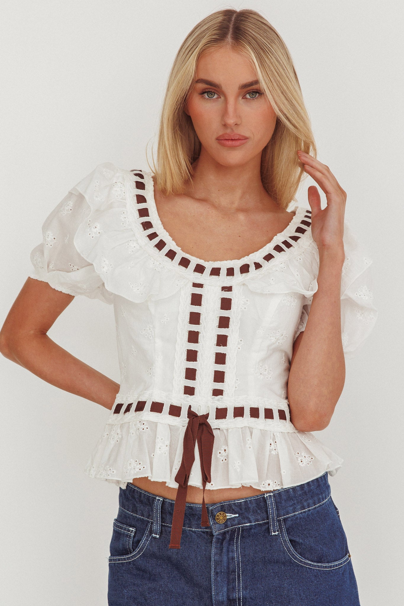 Float through the weekend in our pretty Solea top. It features the sweetest eyelet embroidery and ribbon trim and is perfect for Sunday brunch with your girls. Team it with wide leg jeans and a mules for a chic look.