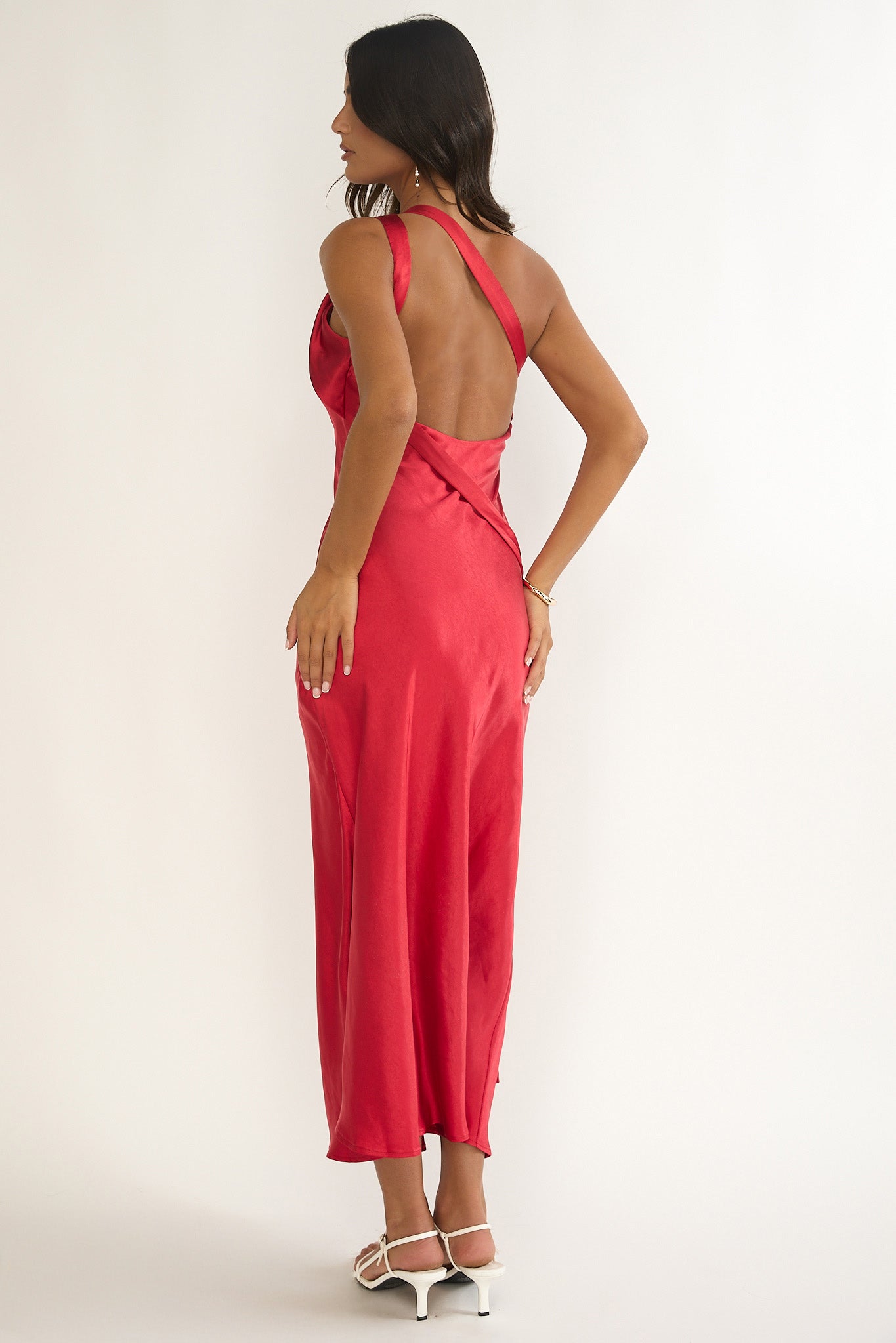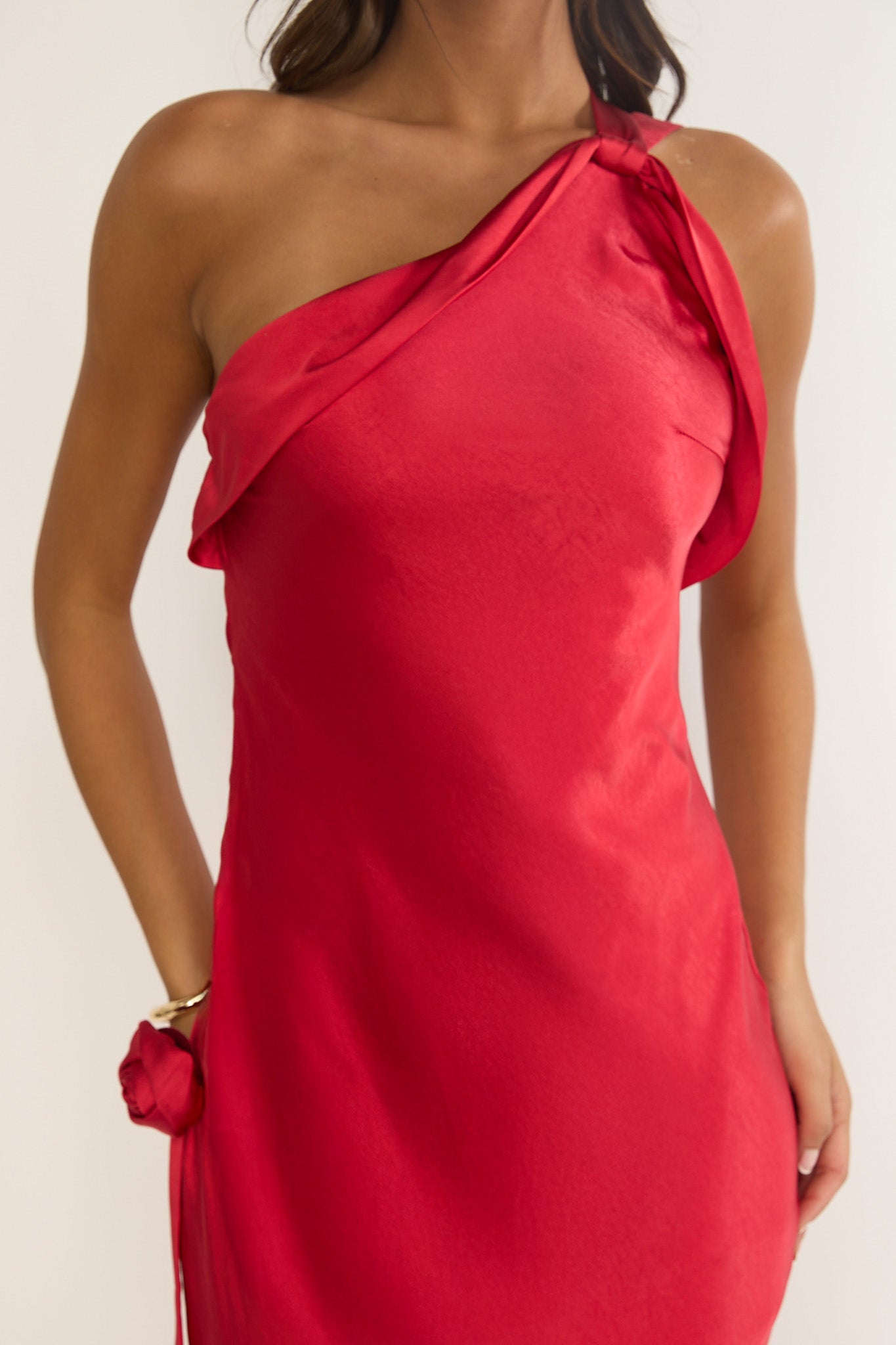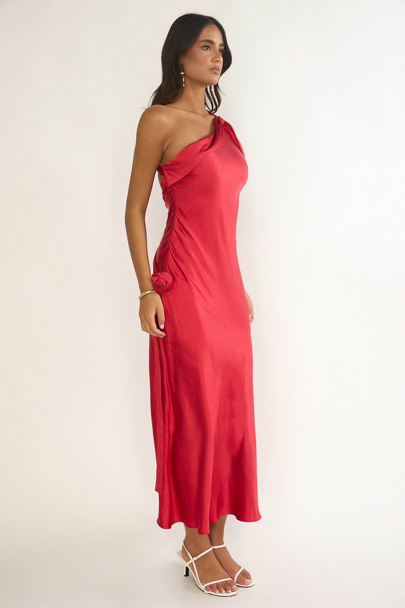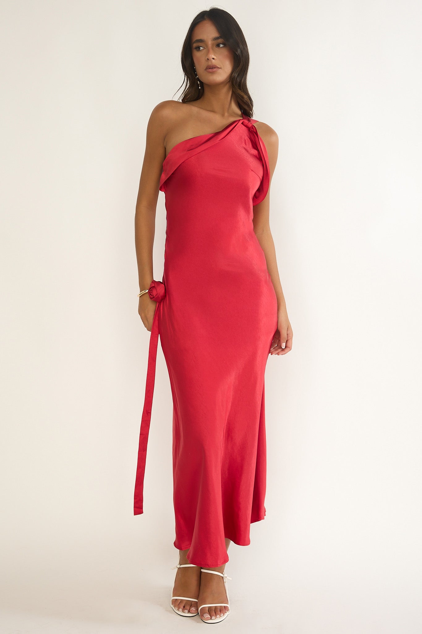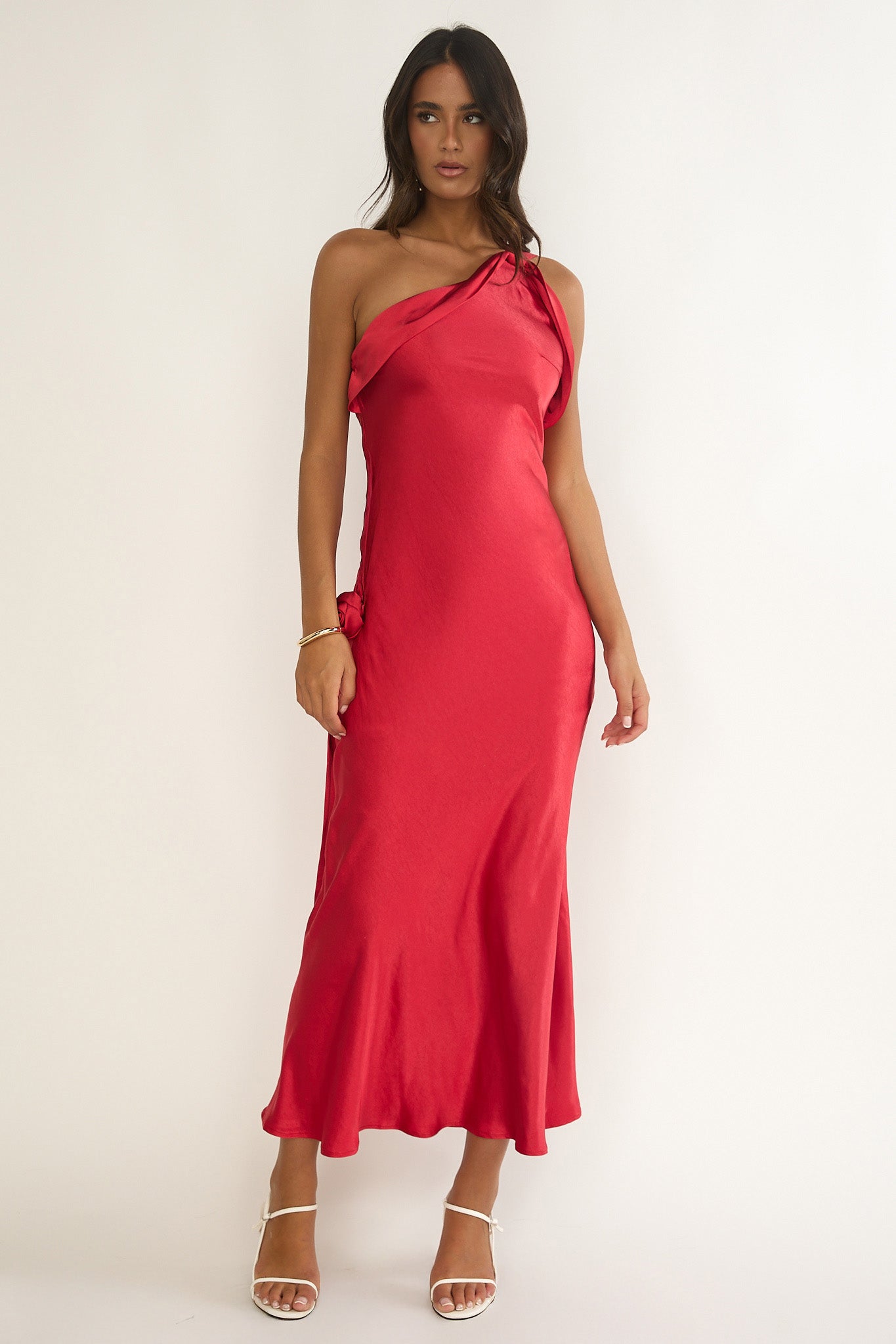 Star Fall One-Shoulder Rosette Maxi Dress Red