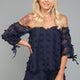 Threaded fringe detail bounce along this adorable off the shoulder romper with sheer sleeves and overlay. Pair with a statement necklace and sky high stilettos.