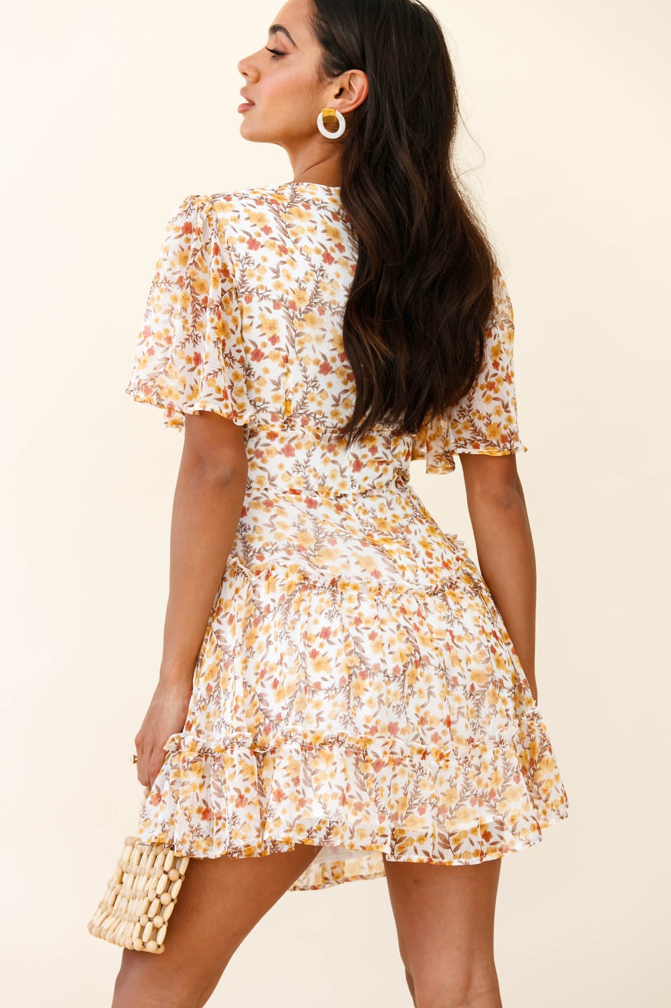 Stolen Moments Angel Sleeve Ruffle Dress Floral Print Yellow Multi