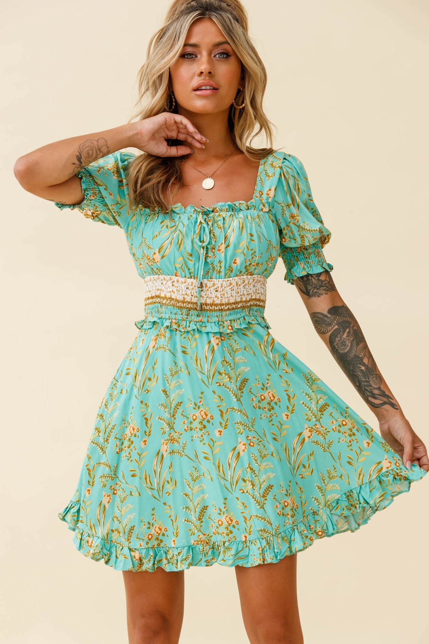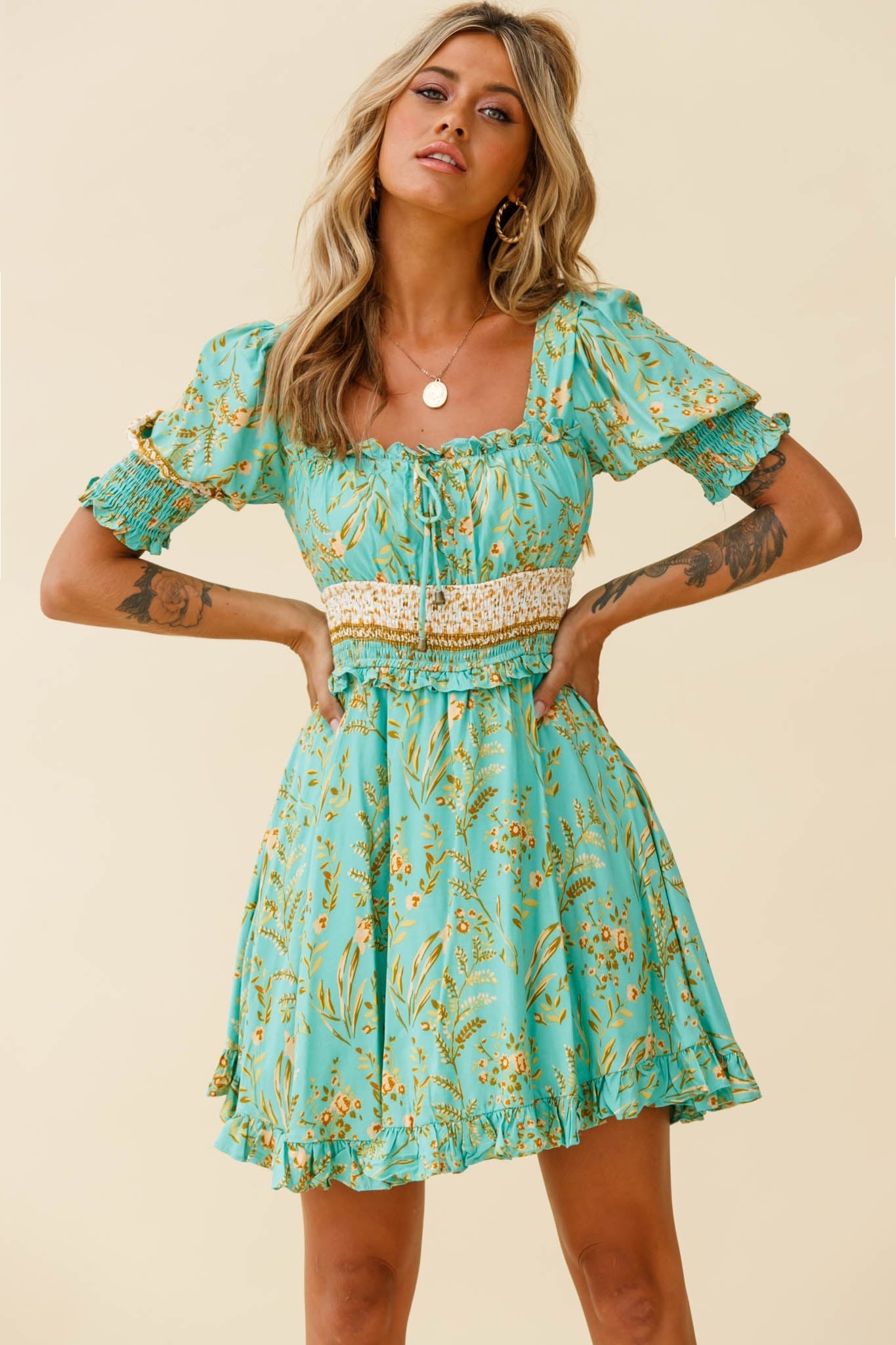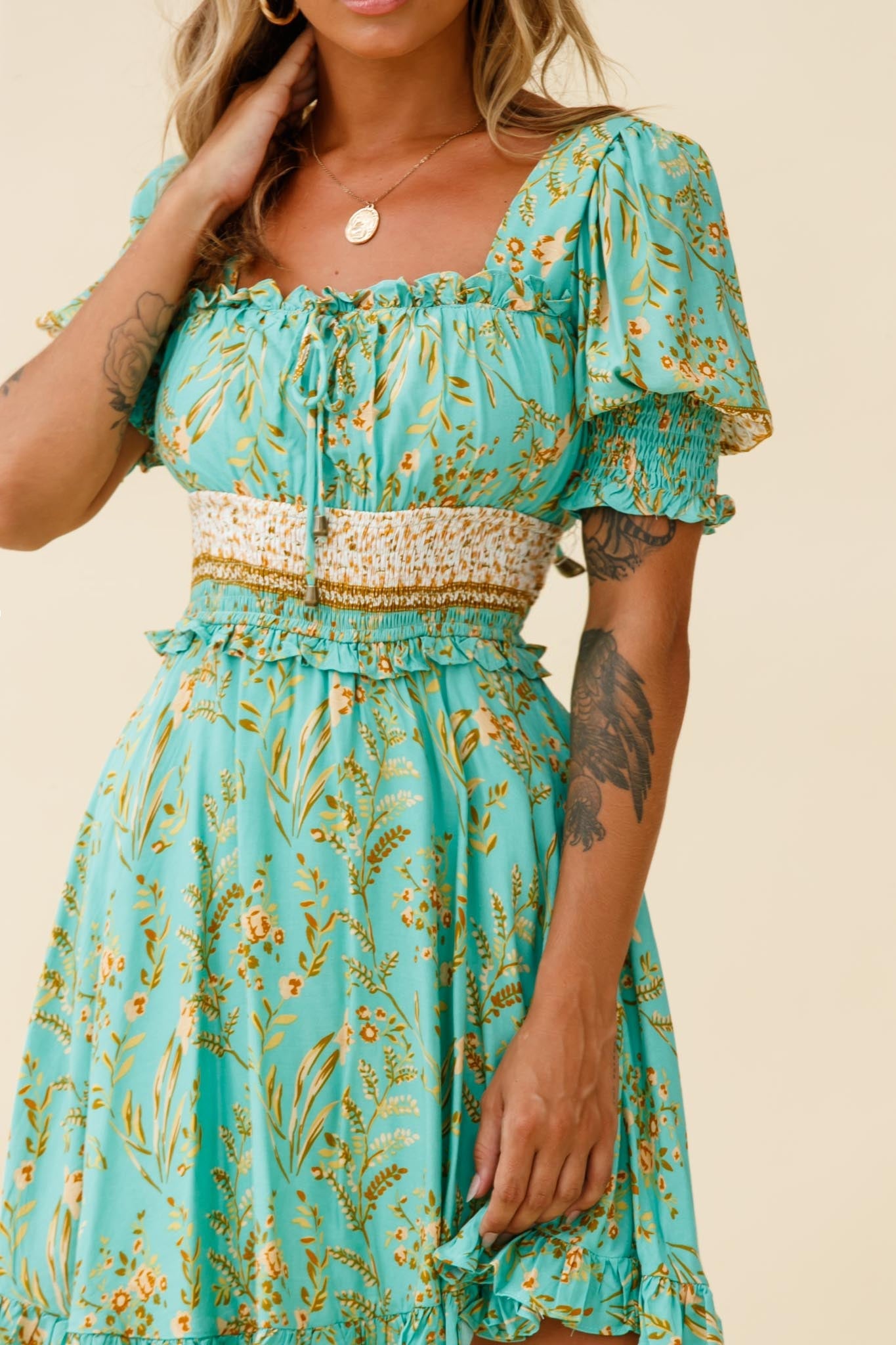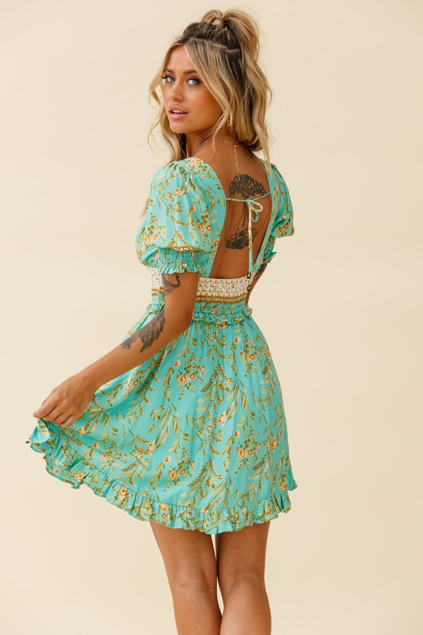 Summer In Paris Puff Sleeve Open Back Dress Botanical Print Mint