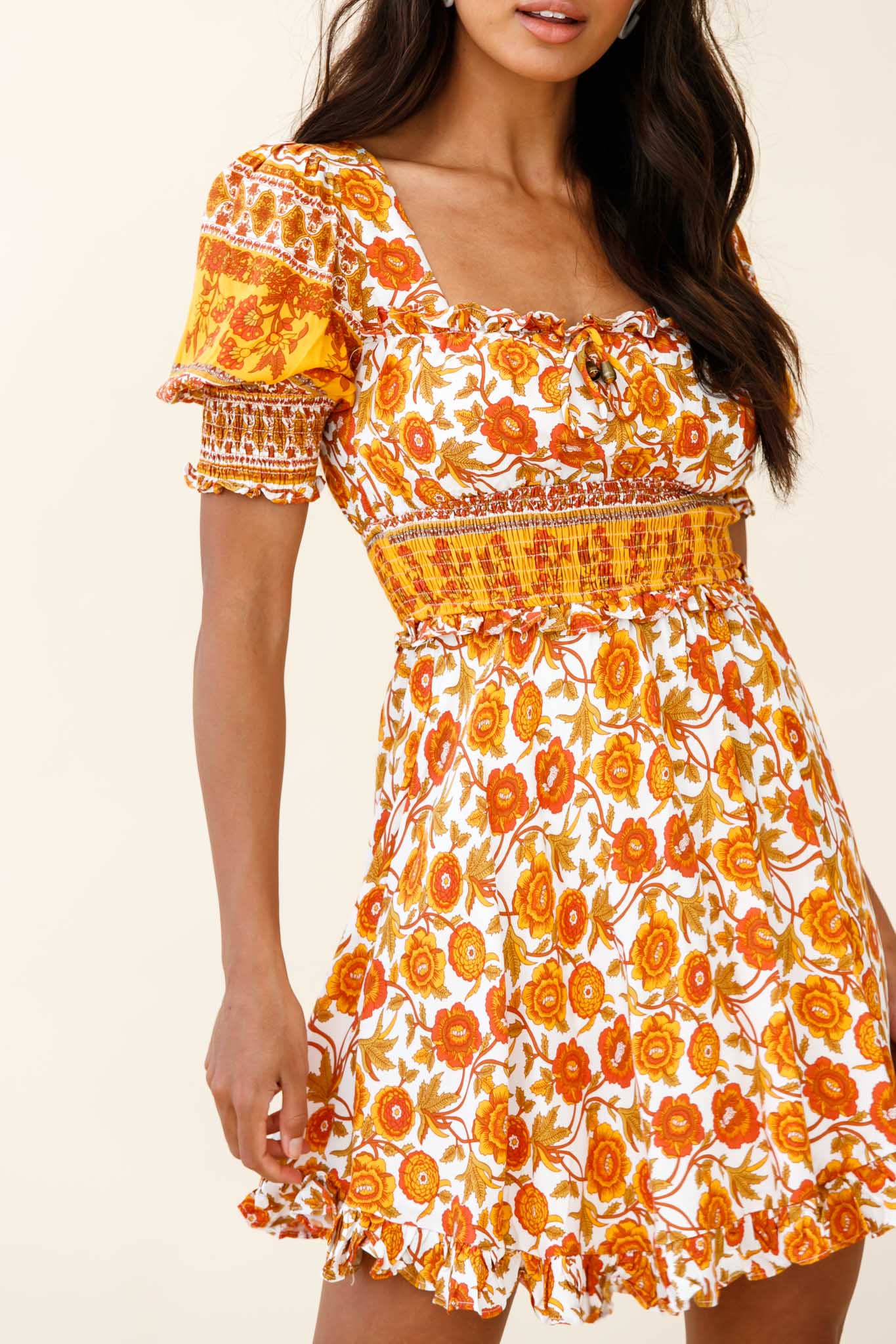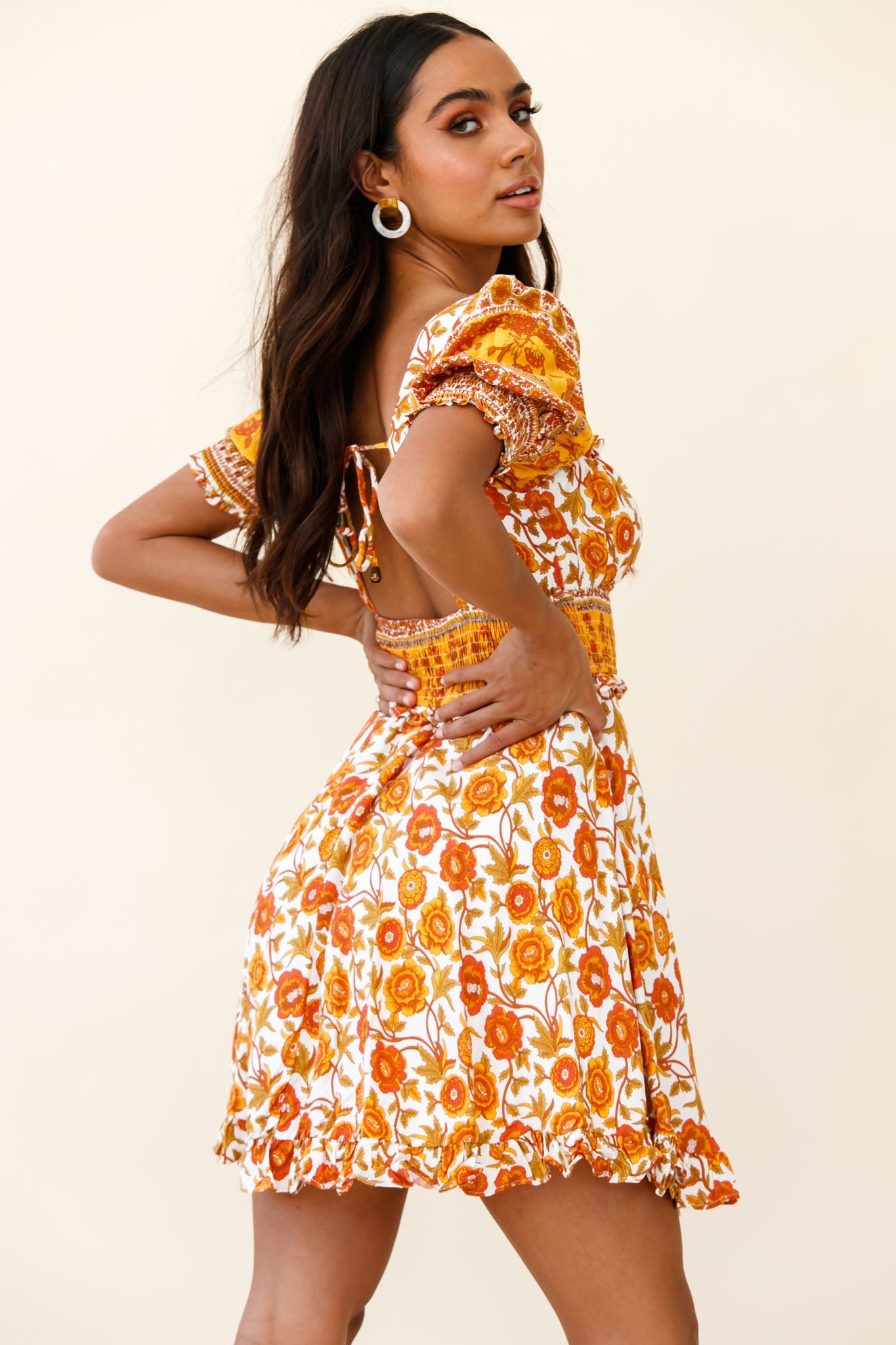 Summer In Paris Puff Sleeve Open Back Dress Floral Print Mustard Multi