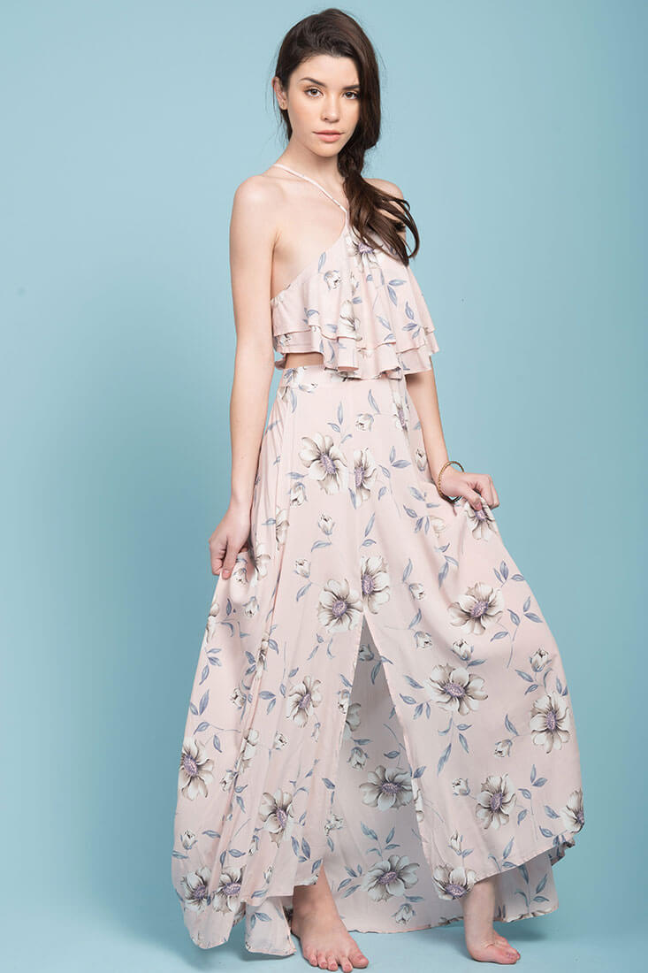 Whether beachy, brunch, or bohemian this dress can do it all! Ruffled top around the bust balance the teasing side cutouts. Wear with slip on espadrilles.