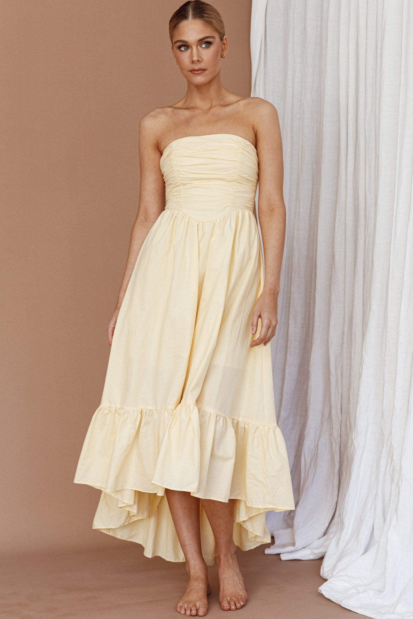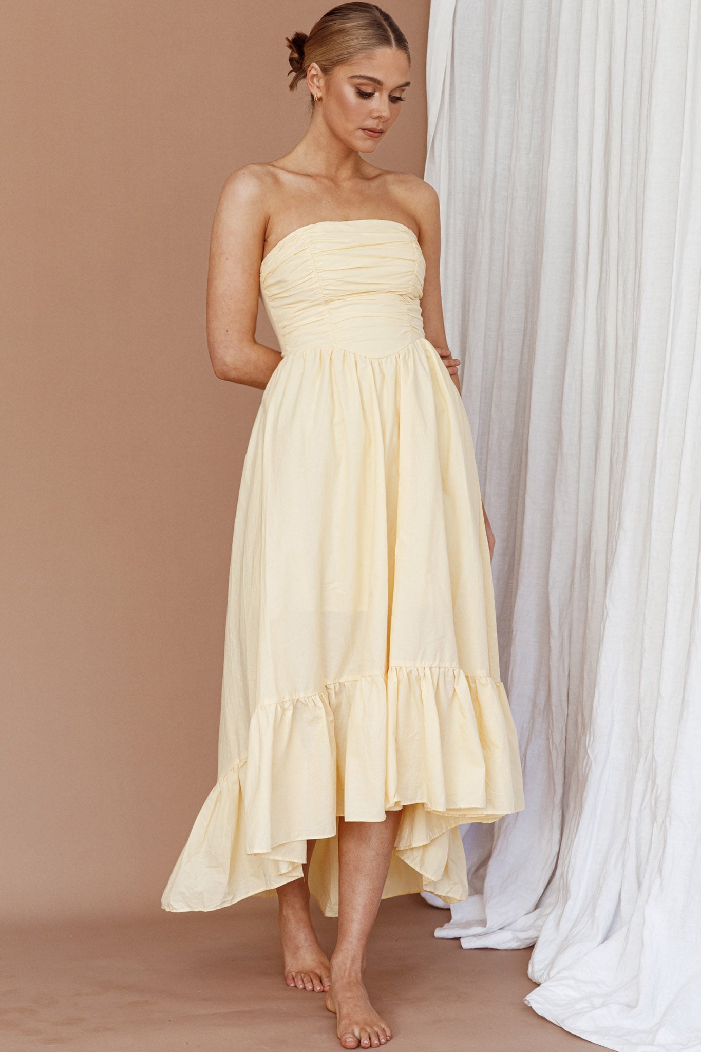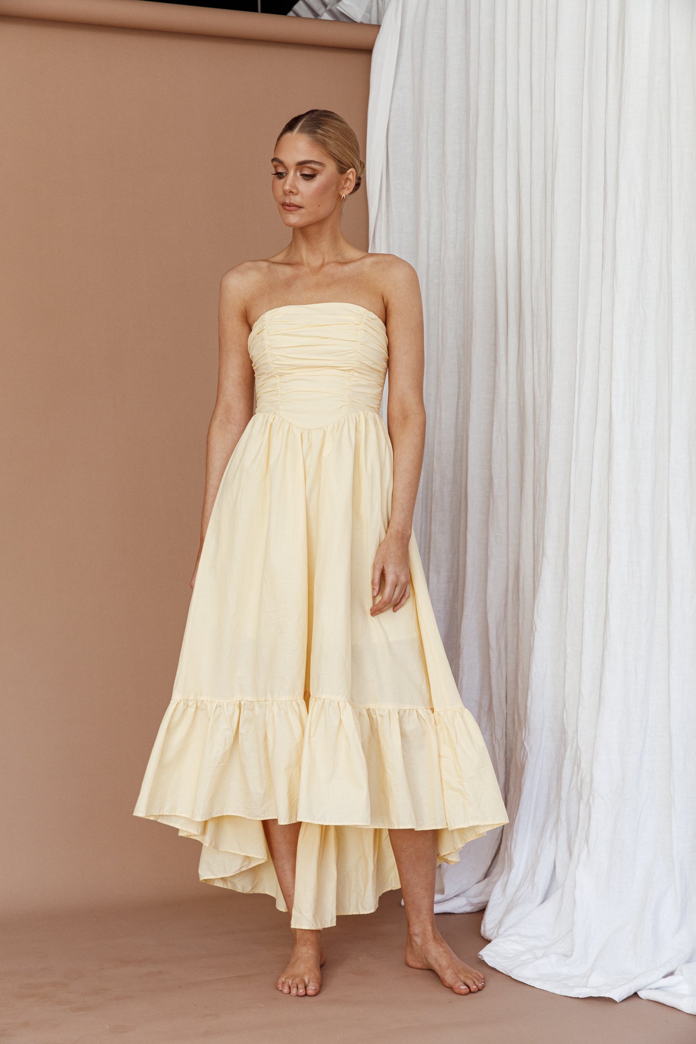Your wardrobe called, it needs this dress. Our Sunday Mornings dress is perfect for weekend lunch dates or a beach wedding. We are in love with the ruching detail in the bodice and wide, ruffle-trimmed hem. Team it with strappy heels and a tote for a chic look.