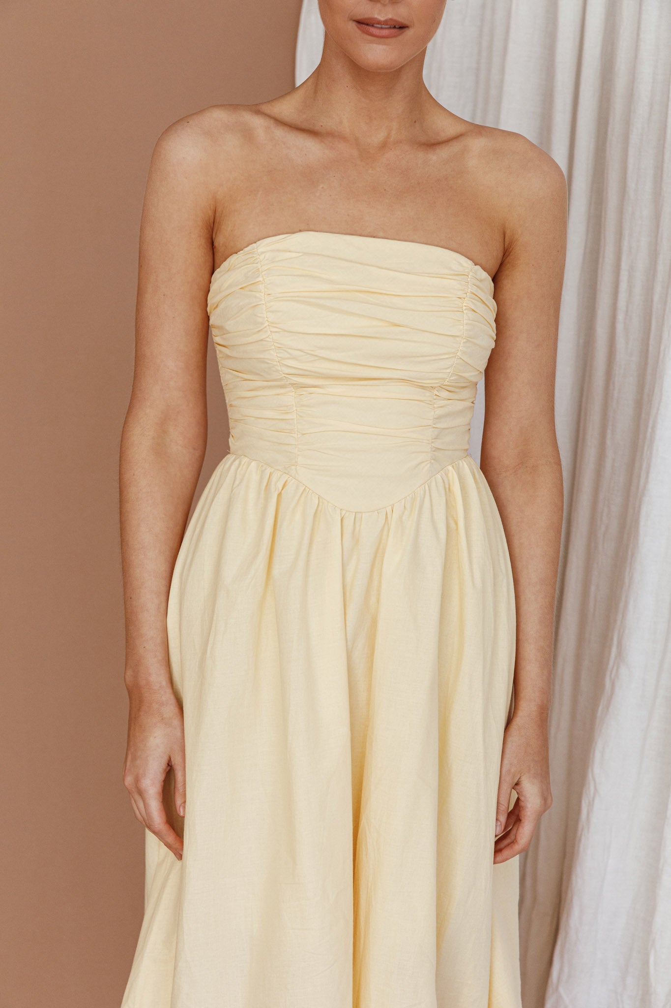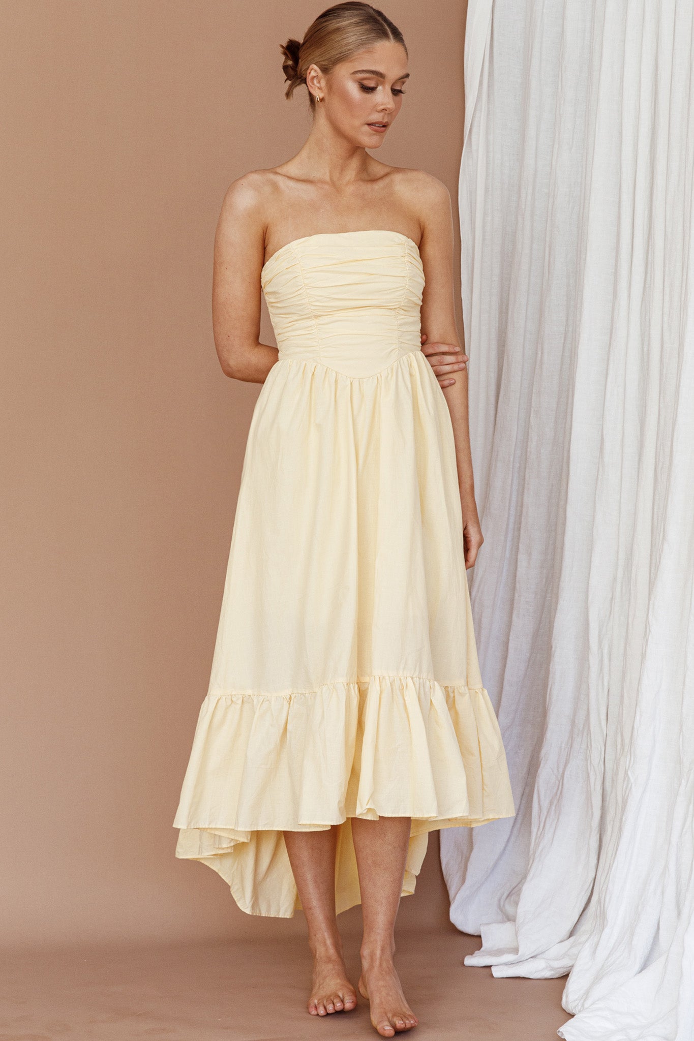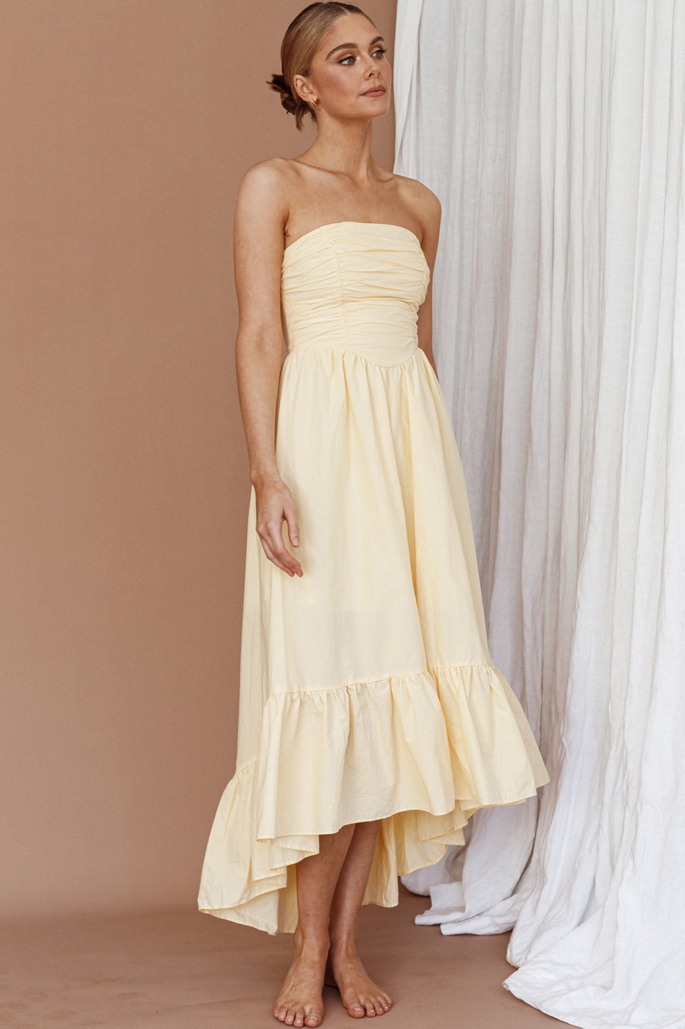 Your wardrobe called, it needs this dress. Our Sunday Mornings dress is perfect for weekend lunch dates or a beach wedding. We are in love with the ruching detail in the bodice and wide, ruffle-trimmed hem. Team it with strappy heels and a tote for a chic look.