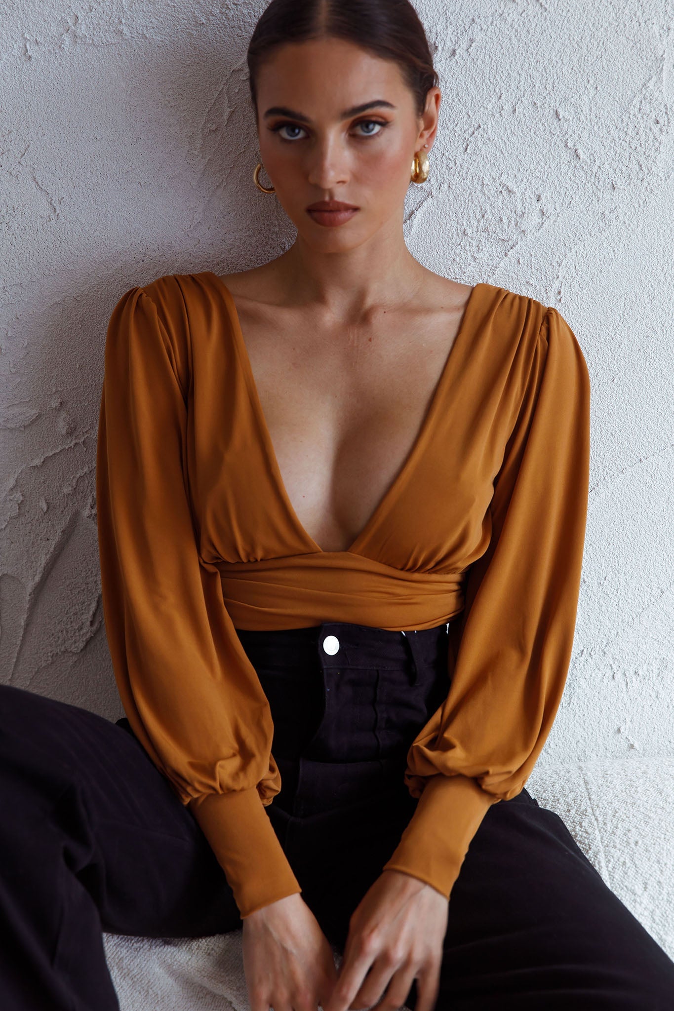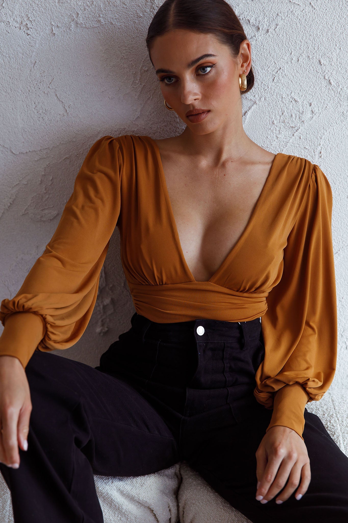 Sunsets In Tahiti Deep V-Neckline Lantern Sleeve Bodysuit Tan