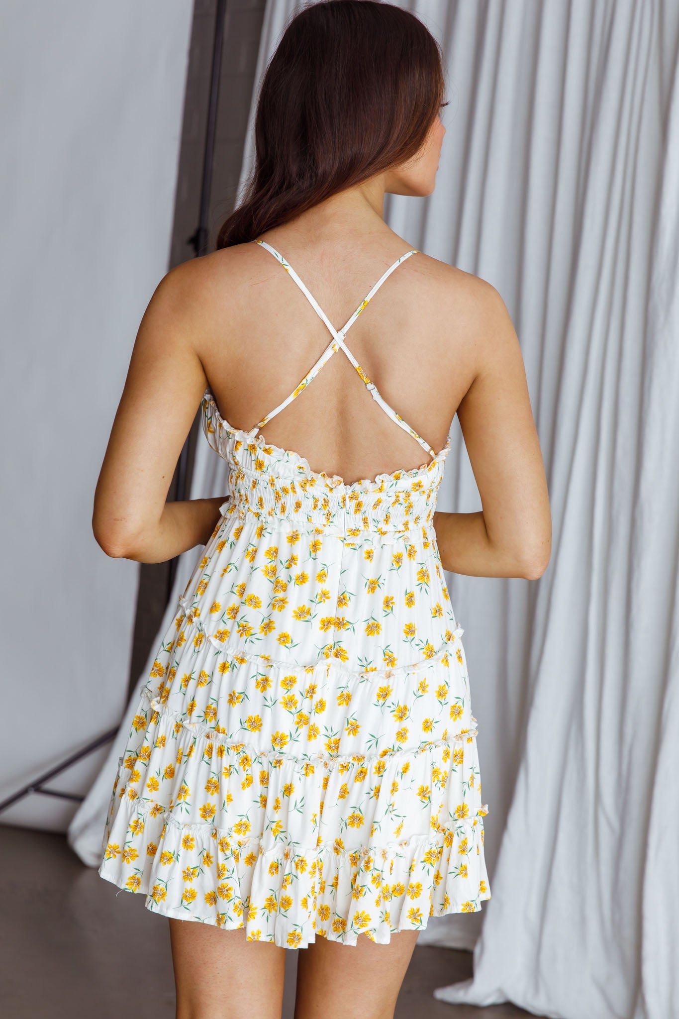 Breeze through your day in our adorable Sunshine Lovers dress. Featuring shirring under the bust and the sweetest floral print. We are loving this teamed with white tennis shoes and a basket bag for a girls' day out.