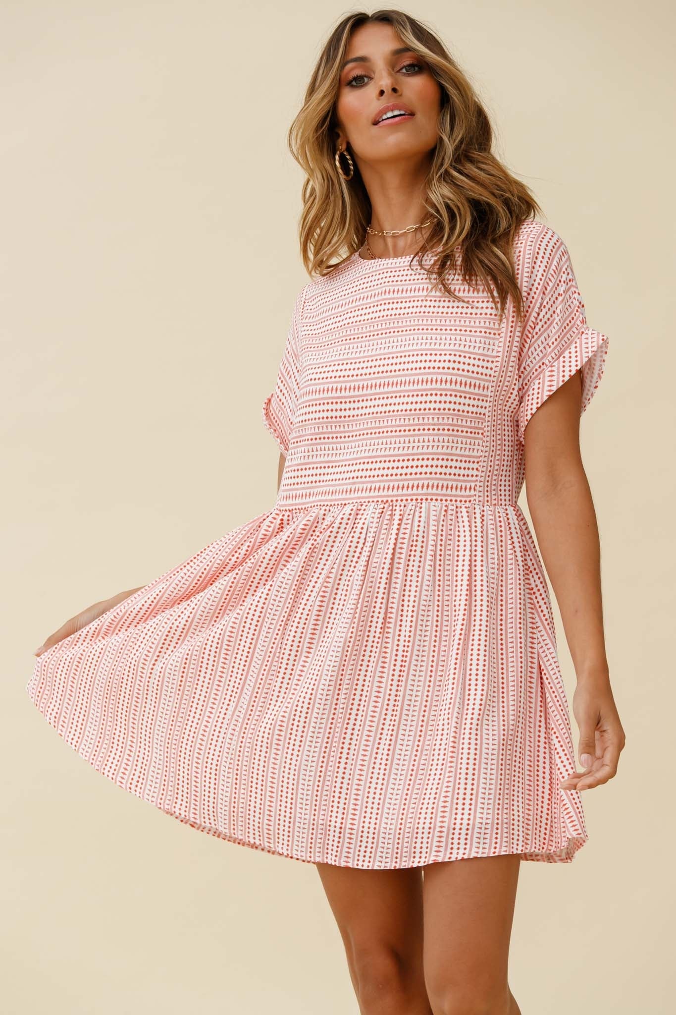 Susie Rolled Sleeve Crew Neck Swing Dress Stripe Pattern Red