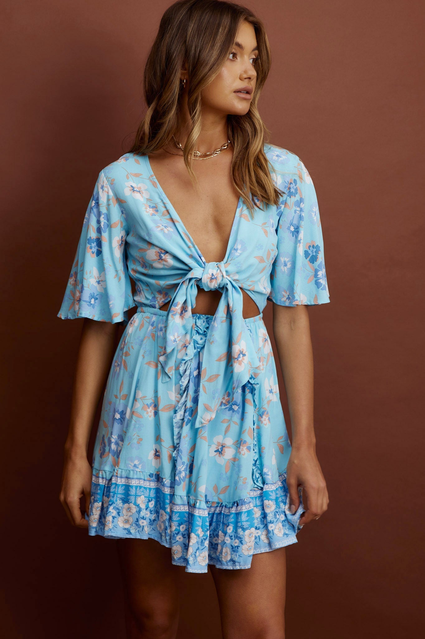Escape to a tropical paradise in our gorgeous Suva dress. How cute is that tie-knot bust detail and cut-out waist feature? Perfect for those warm summer days teamed with hessian wedges and a straw tote. You'll look like paradise!