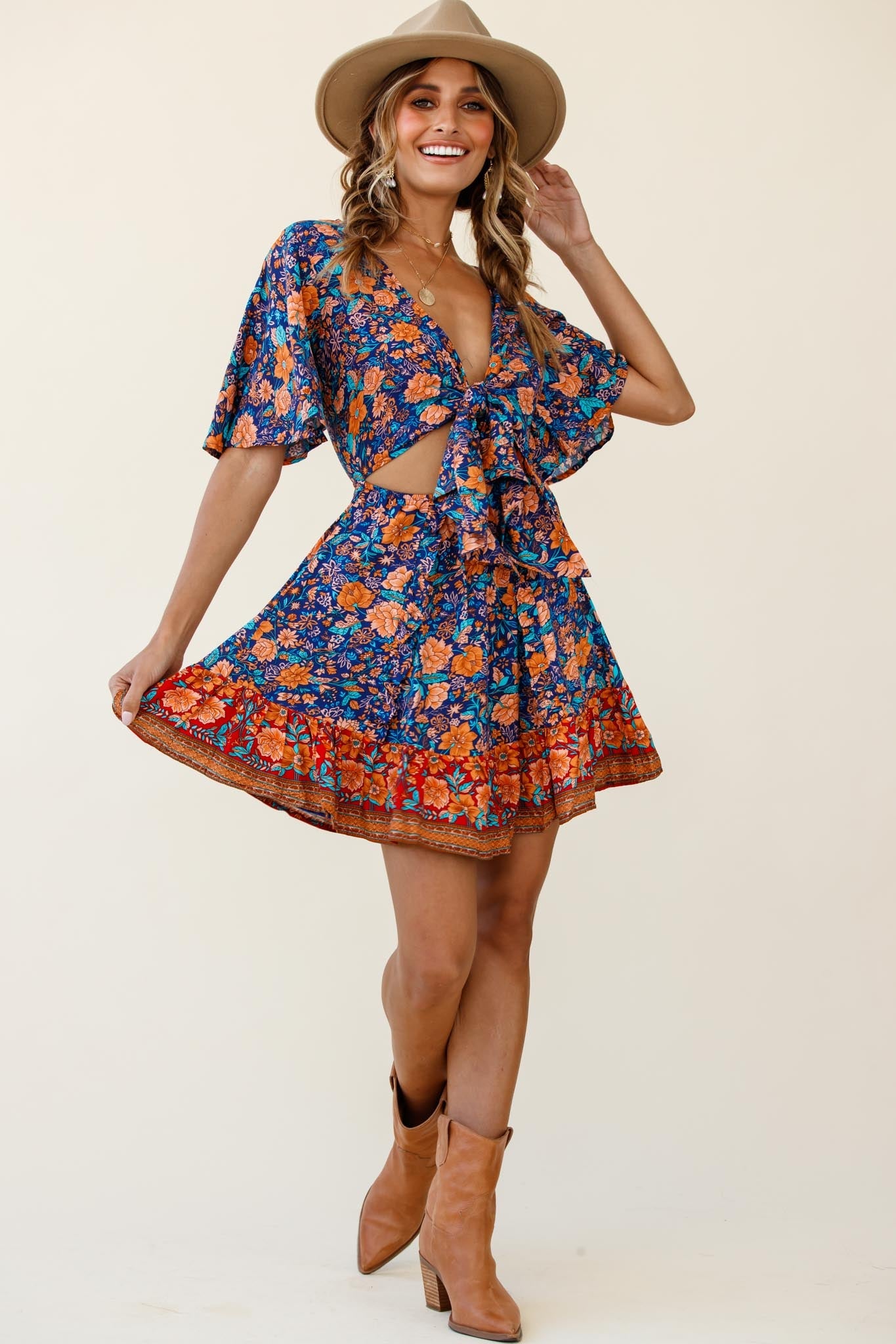 Escape to a tropical paradise in our gorgeous Suva dress. How cute is that tie-knot bust detail and cut-out waist feature? Perfect for those warm summer days teamed with hessian wedges and a straw tote. You look like paradise!