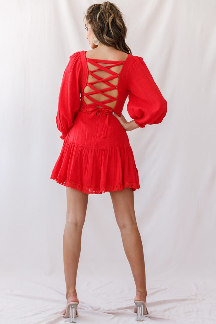 Sweetheart Corset-Back Lantern Sleeve Dress Red