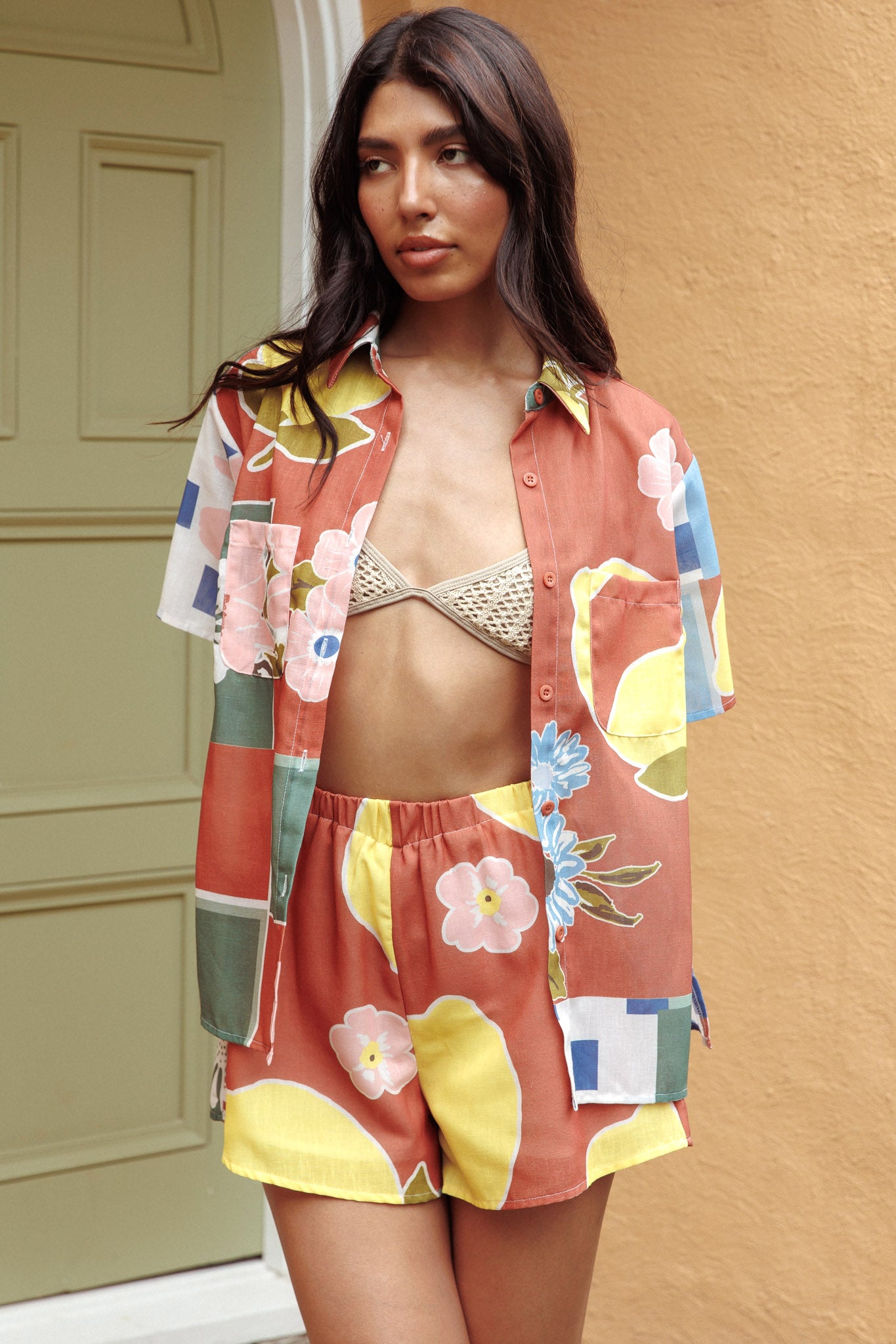 The weekend is calling and you need this shirt. Our Swing Of Things shirt is perfect for coffee dates with your girls or strolling the vintage markets. We are in love with the sweet citrus and floral print. Team it with its matching shorts and sandals for a casual-chic look we are all about.