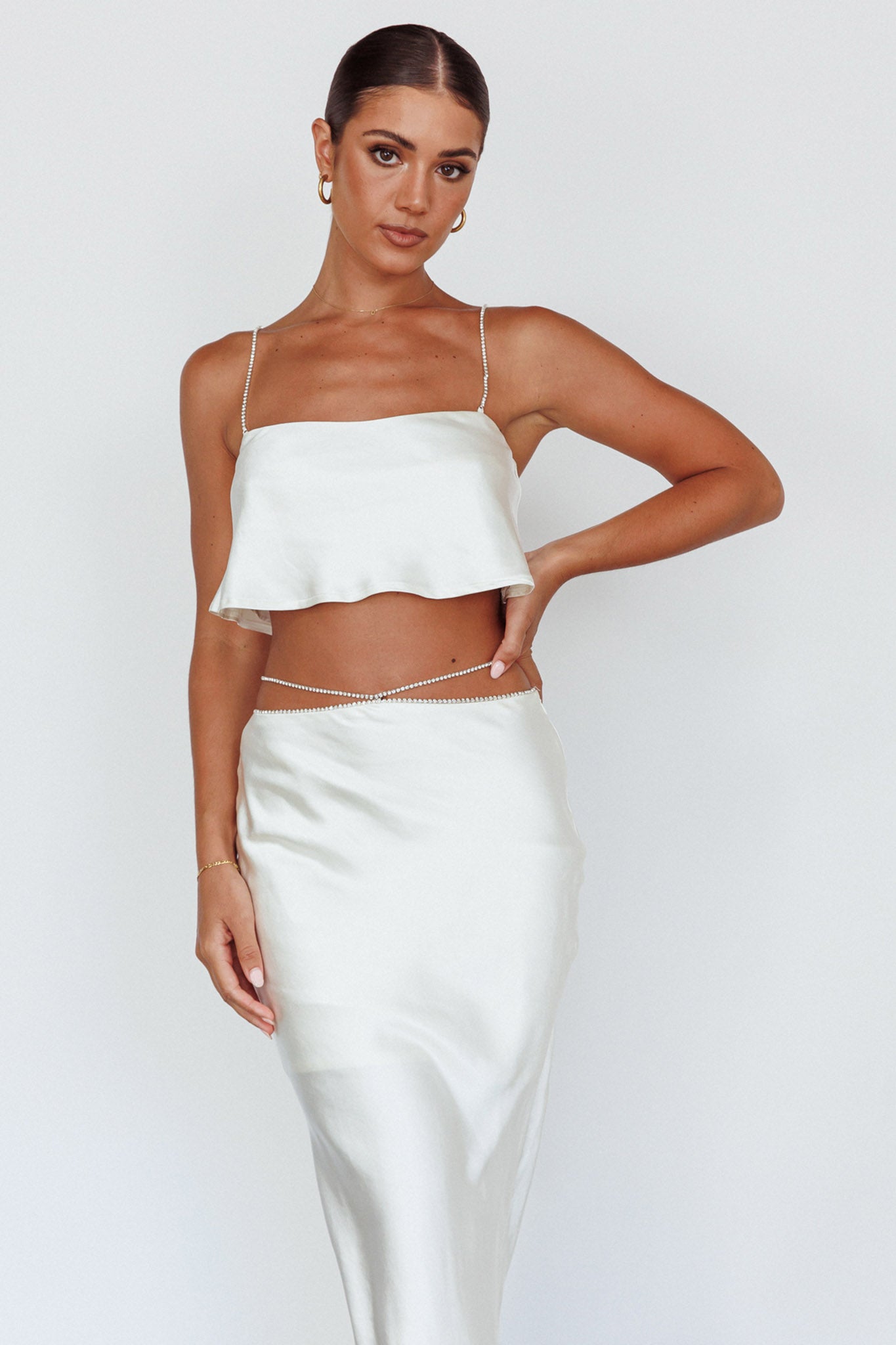 Make an entrance in our gorgeous Tahni maxi skirt. Featuring diamante chain trim and a soft, satin fabric; it's perfect for a glam girls' night out. Team it with its matching maxi skirt for a look that will turn heads.
