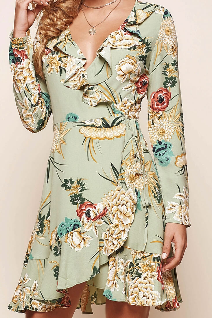 This flirty and feminine dress is perfect for work or play. Featuring a pretty floral print, wrap tie front and ruffle neckline, this dress can easily go from office-chic to wine o'clock with a simple change of shoes. Style it with pointed flats for the office and throw on some strappy nude heels and a red lip for after hours. Lookin' good, girl!
