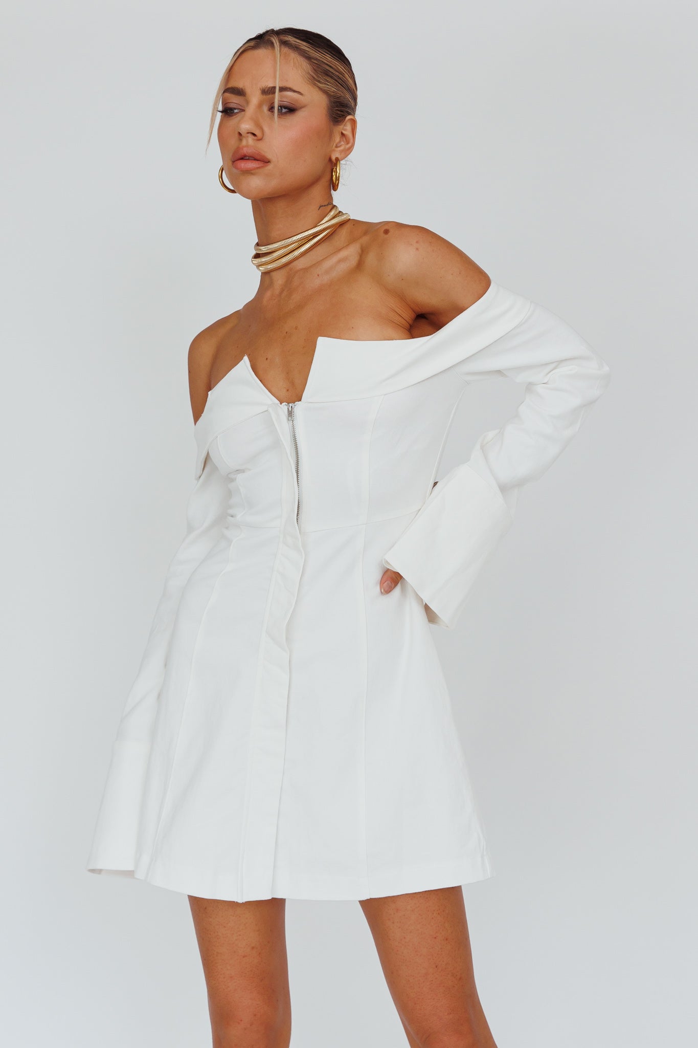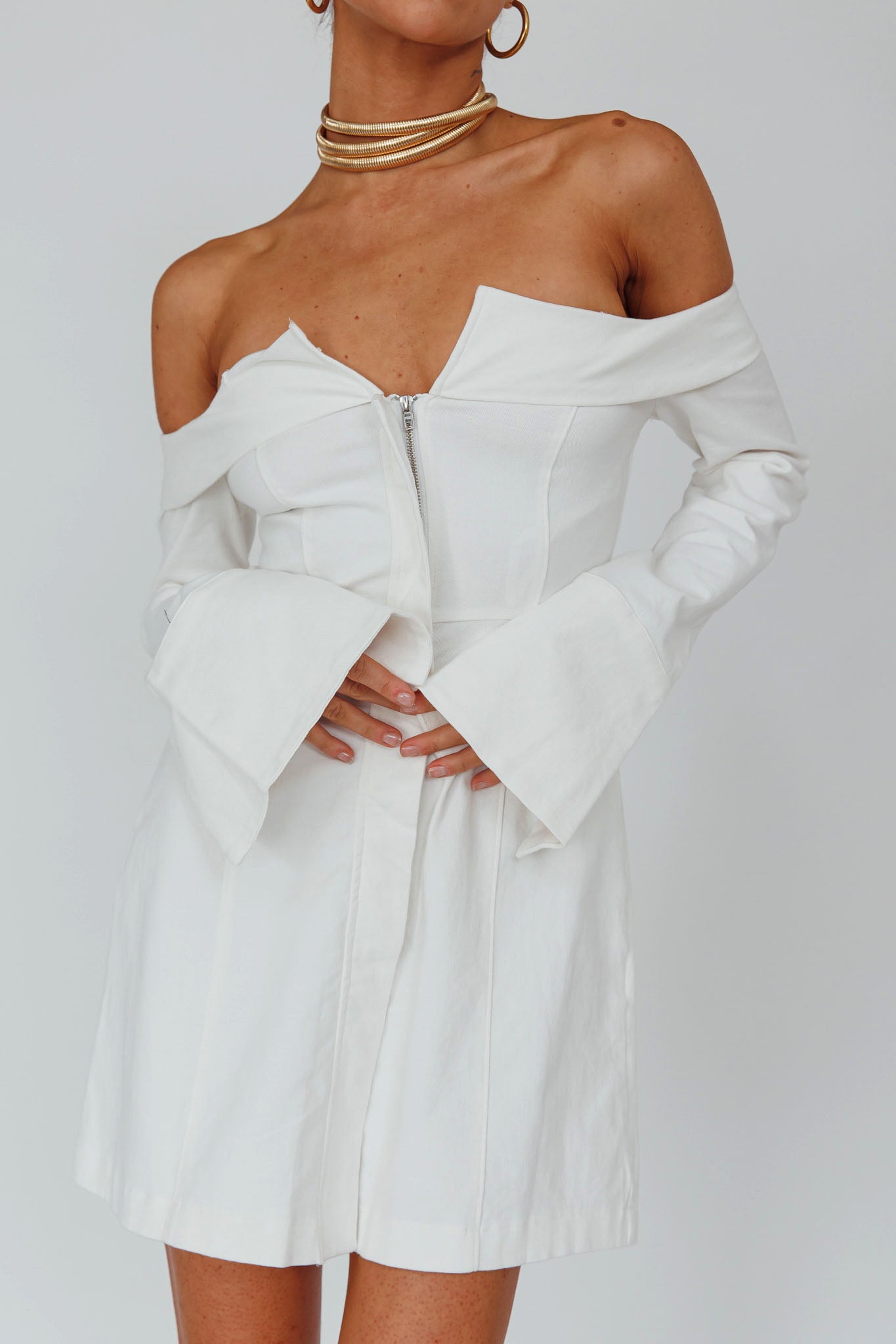 You'll go straight to the best-dressed list in our super chic Tamra mini dress. We are obsessed with its foldover neckline and zipper detail in the front. Perfect for a night out with your girls teamed with knee-high boots and a saddle bag.
