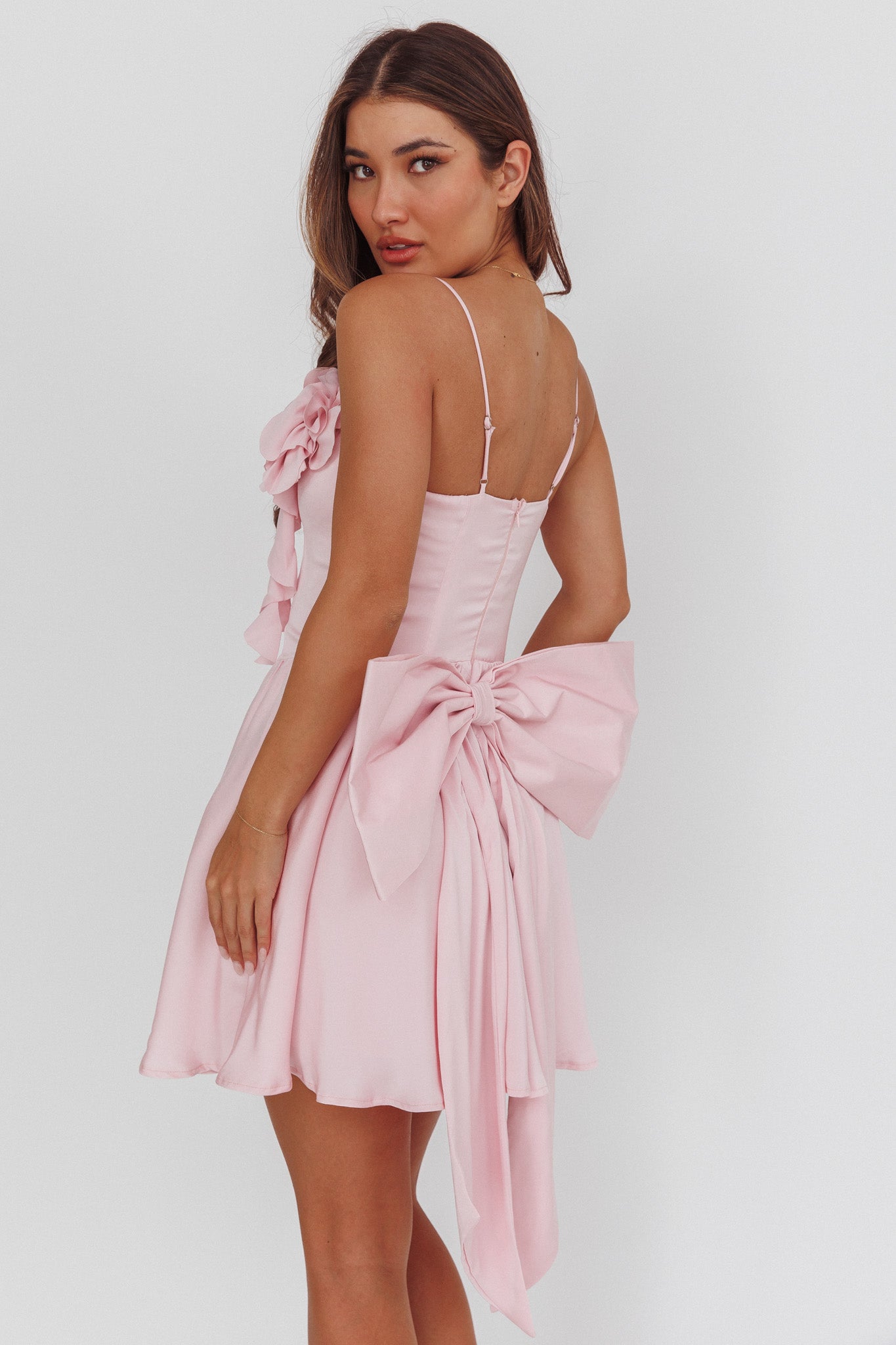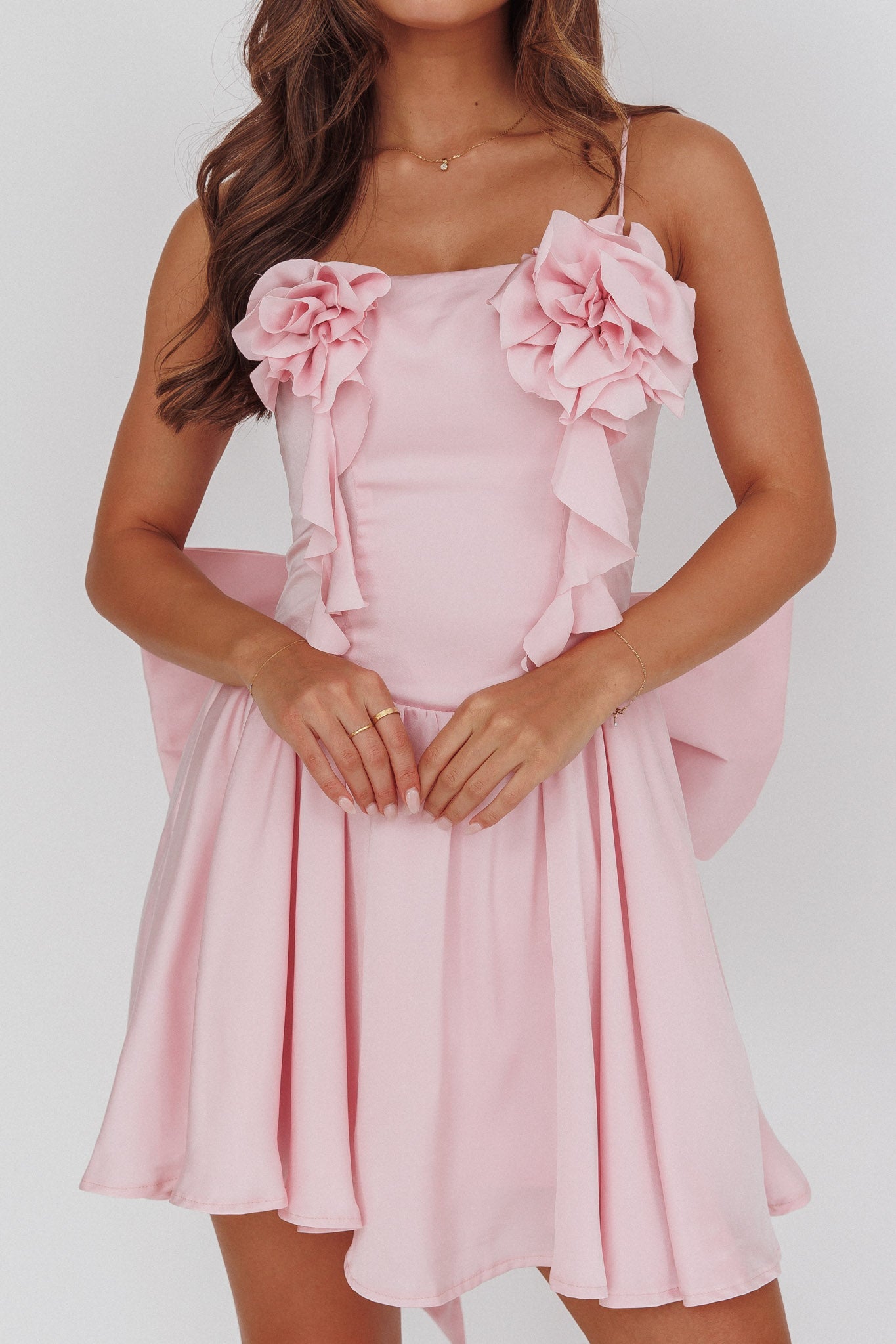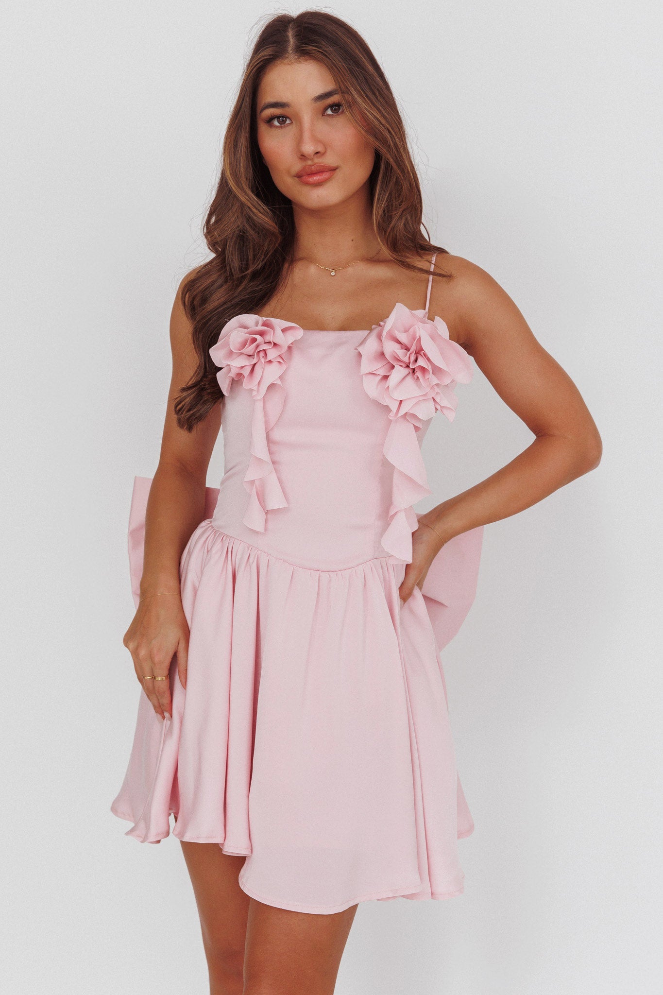Steal the show with our pretty Tell Me Twice mini dress. Featuring floral decorations in the bust and a gorgeous, oversized bow in the back. It's perfect for a birthday celebration teamed with kitten heels and a purse for a look that's fit for a princess.