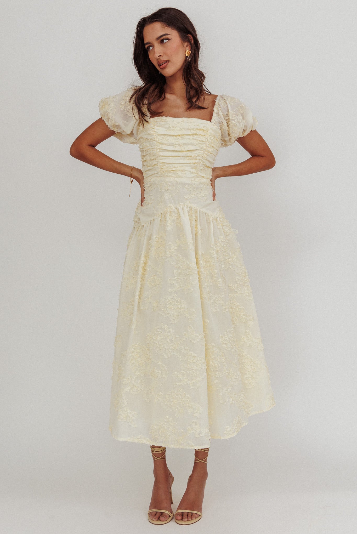 Unleash your feminine side with our Telma midi dress! This dress features romantic puff sleeves that's sure to turn heads wherever you go. The A-line silhouette offers a flattering fit for all body types. Whether you're strolling through the botanical gardens or on a romantic date, this dress effortlessly blends style with statement.