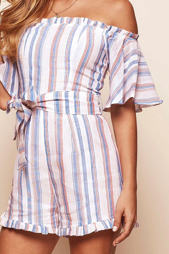 Get Summer ready in this seriously cute, on-trend romper. Featuring a chic stripe print, a flattering bardot neckline and a belted waist tie. Style this up with beige ankle boots and a fitted denim jacket for the perfect summer-chic look.