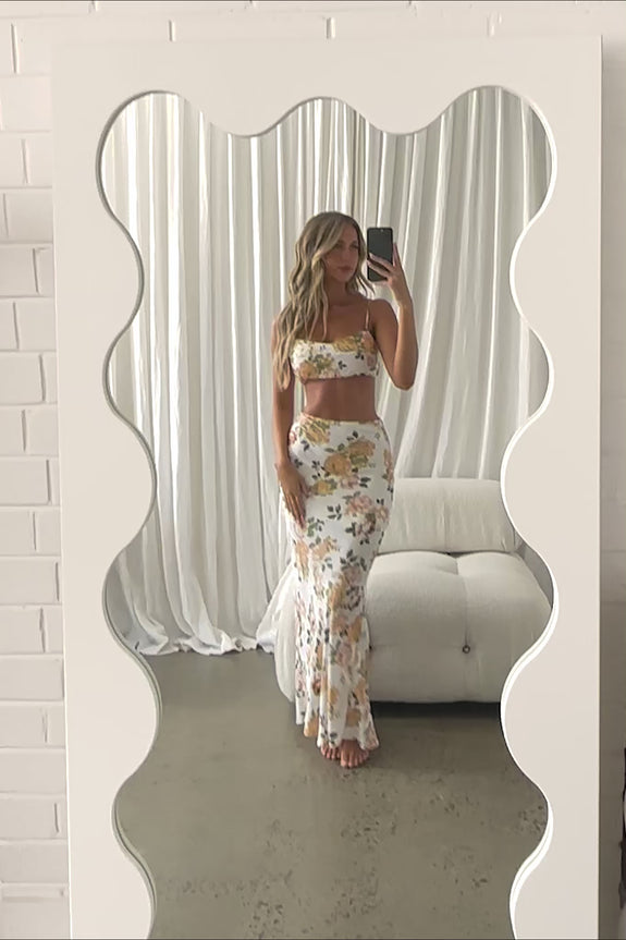Jaws will drop when you strut by in our The Moment maxi skirt. Featuring a pretty floral print and zipper in the back, it's perfect for a girls' night out or special occasion. Team it with its matching crop top and clear mules for an unforgettable look.