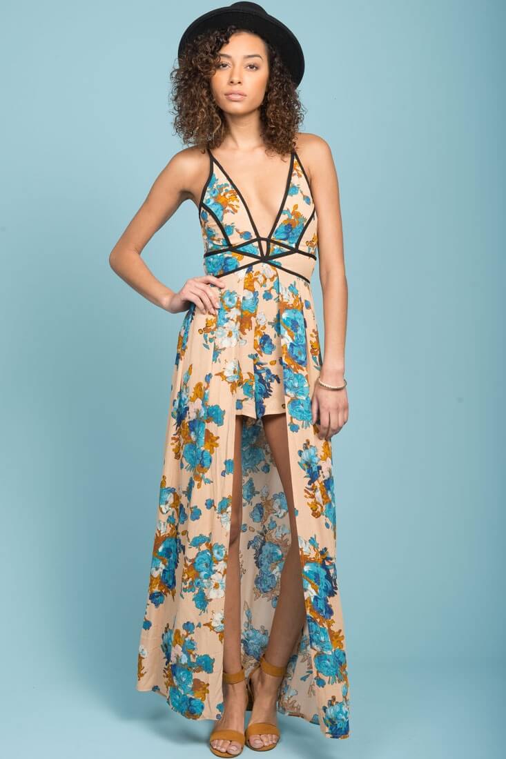 Embrace the goddess within! This flirty V-neck sends all of the right signals and is elegantly draped with floral fabric.