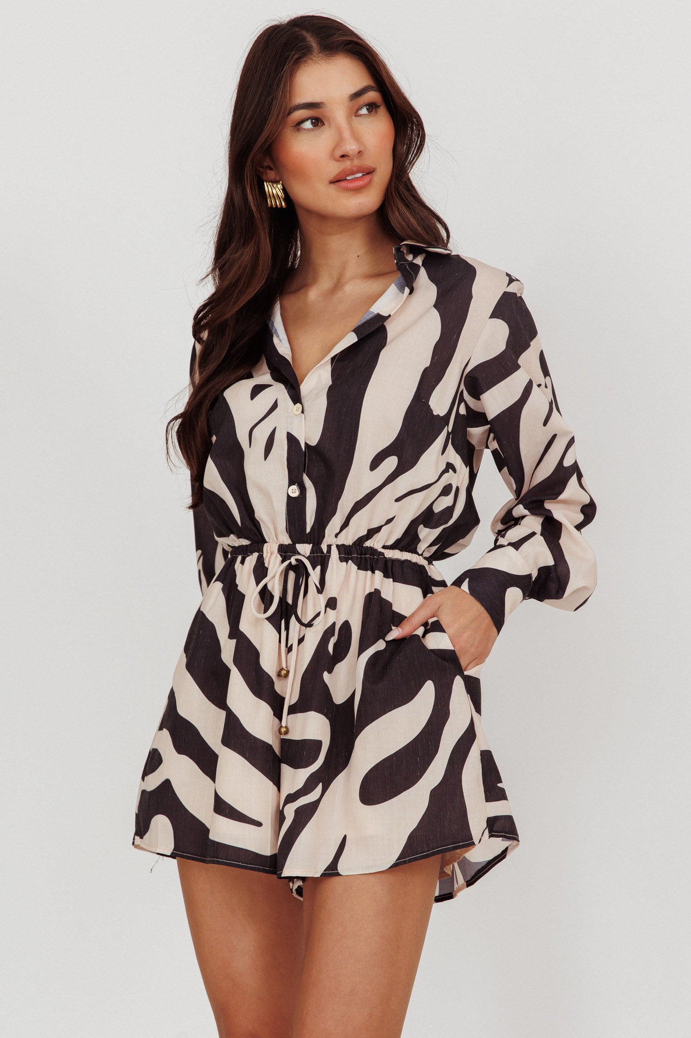 Hello, gorgeous! You will go straight to the best-dressed list in our stylish Tiki romper. Perfect for weekend lunch dates with your besties! It features a button-up front and a stylish zebra stripe print, that is sure to make you stand out!. Team it with wedges and a tote for a look we are loving.