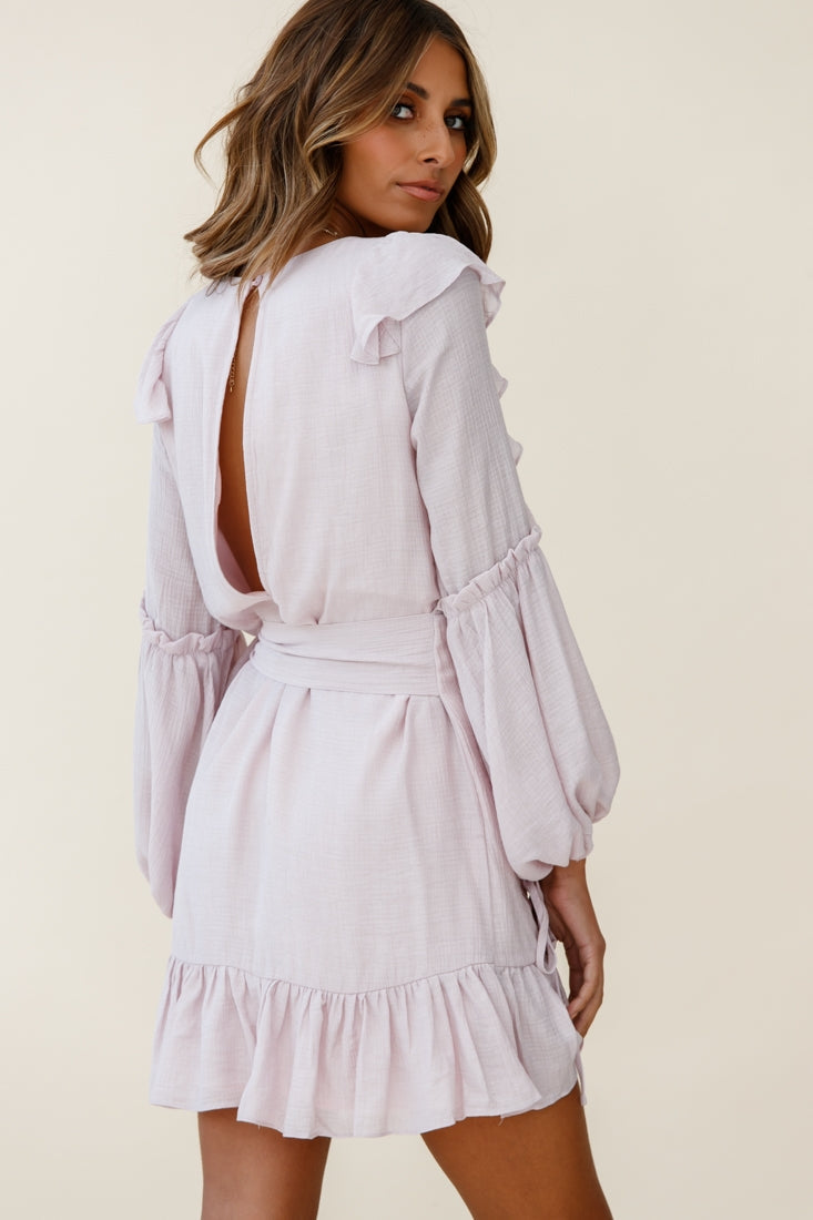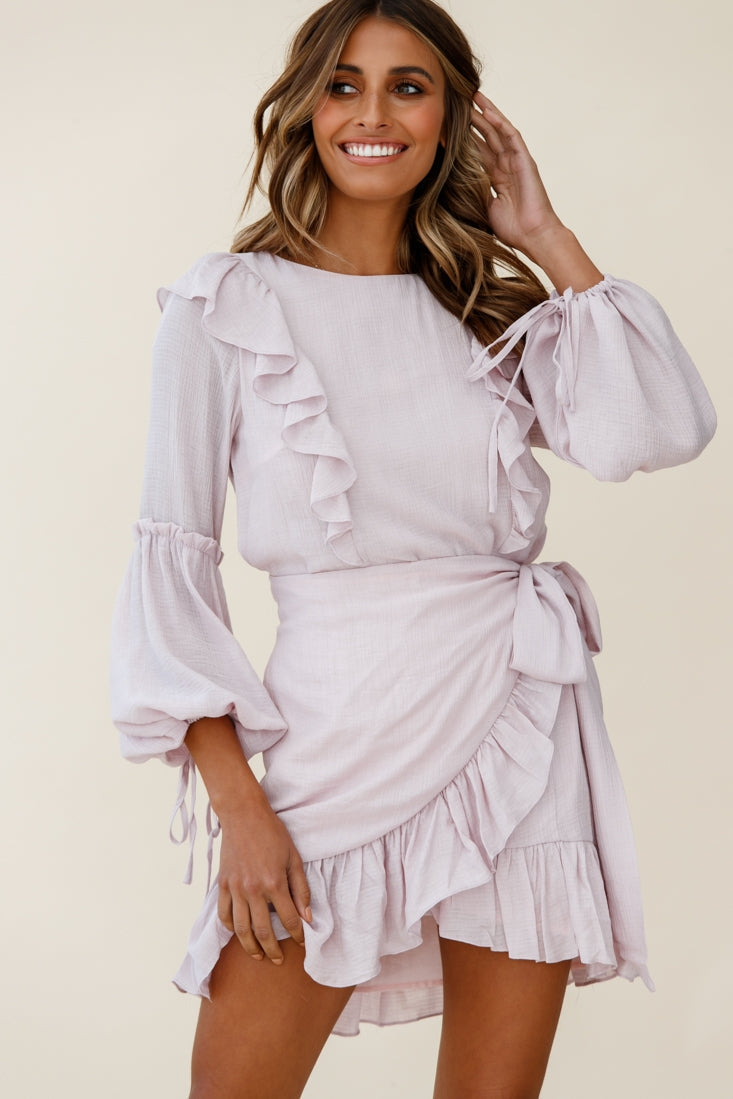 Turn heads in our pretty Tila dress. Partially lined, it features long balloon sleeves, ruffle detailing in the torso, a wrap-front skirt that ties at the side and super cute ruffle hem. Perfect for champagne brunches teamed with nude heels and a small tote.