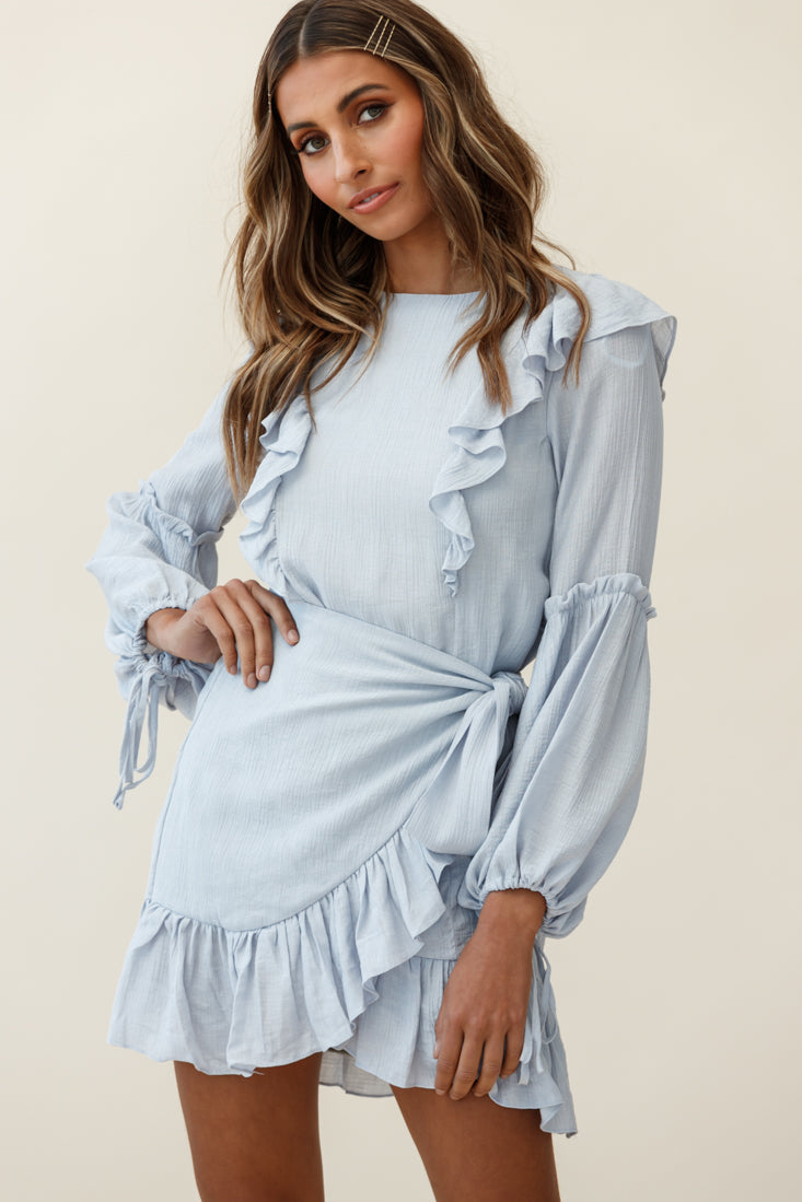 Turn heads in our pretty Tila dress. Partially lined, it features long balloon sleeves, ruffle detailing in the torso, a wrap-front skirt that ties at the side and super cute ruffle hem. Perfect for champagne brunches teamed with nude heels and a small tote.