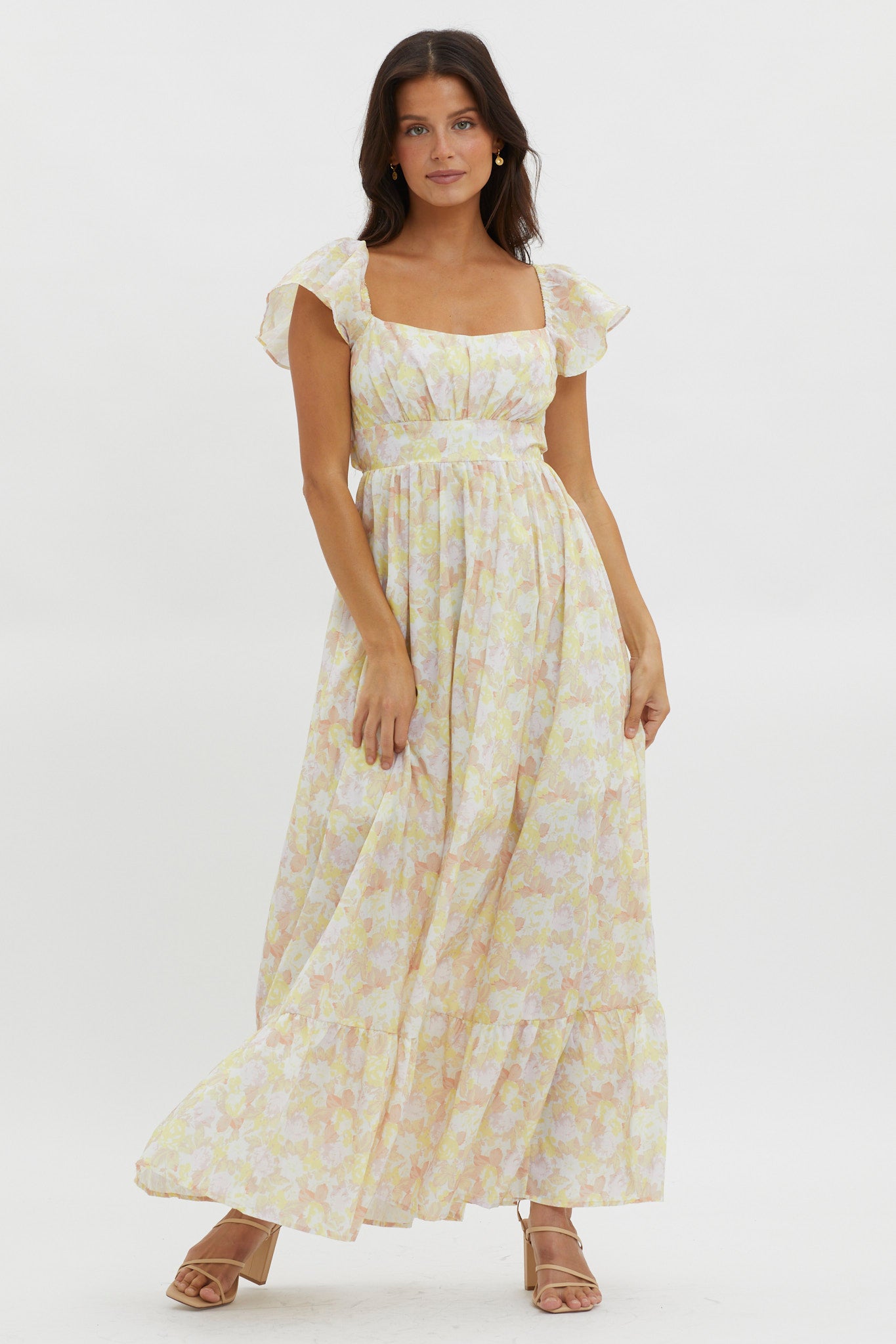 Twirl through your day in our pretty Touch The Sky maxi dress. Featuring flutter sleeves and a tied back, it's perfect for weekend brunch with your girls. Team it with mules and a tote for a dreamy look.