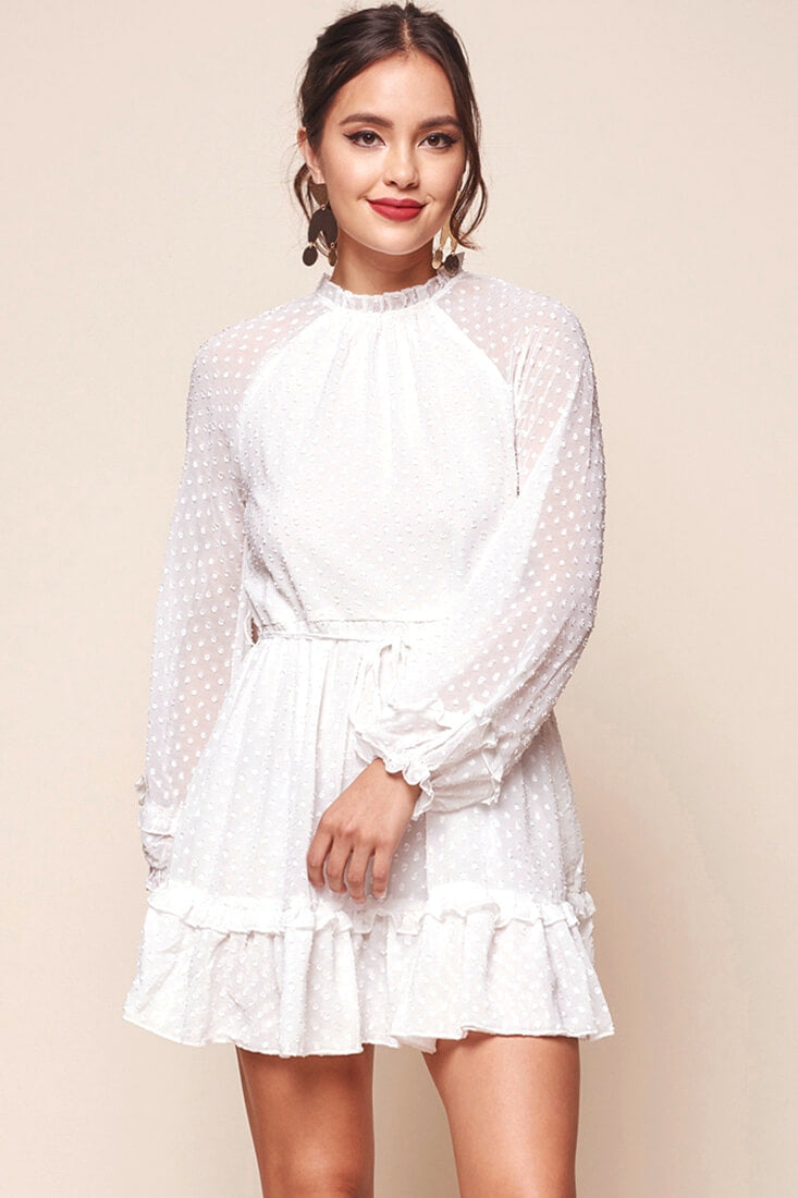 Slinky and classic cut dress with sheer long sleeves, subtle waist tie, and open back. Fabric has a linen feel with textured detail along the dress. Pair with tan heels.