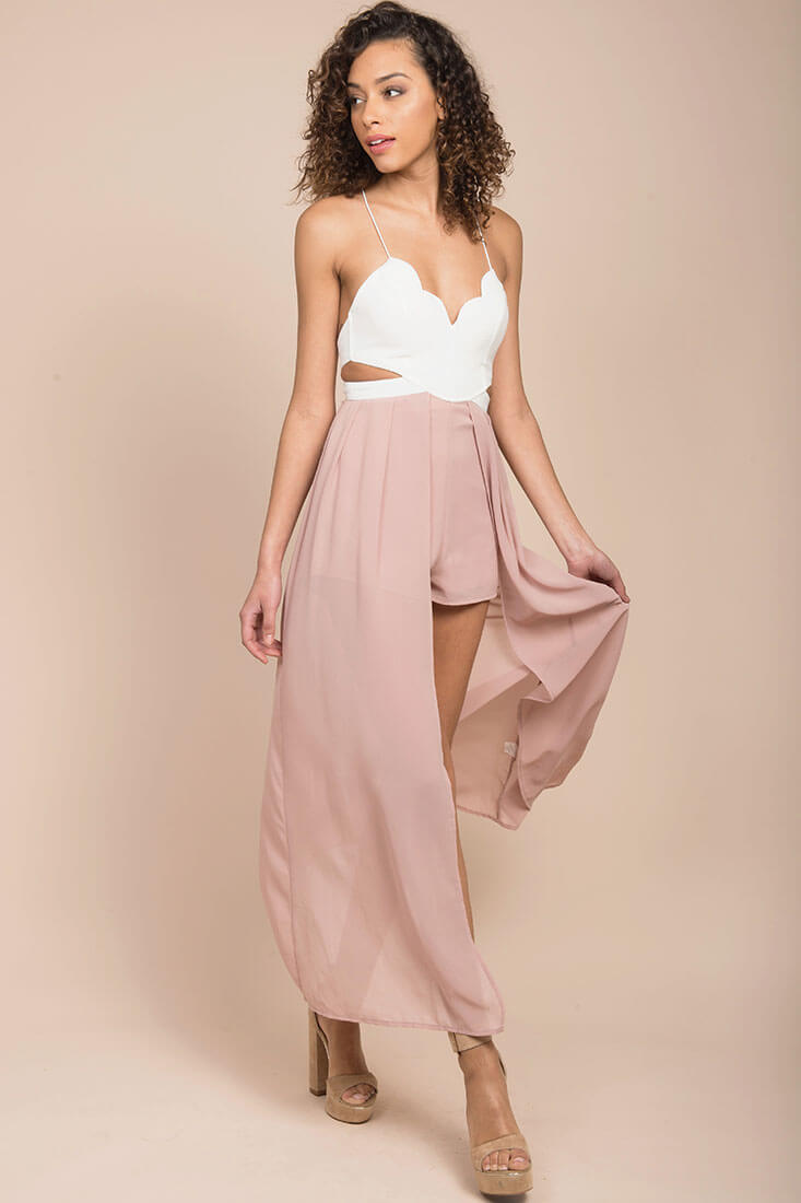 Sweet ivory heart-shaped bodice flows effortlessly into this blush-colored, caped romper. Peak through cutouts frame the waist and accentuate those curves. Pair with nude pumps.