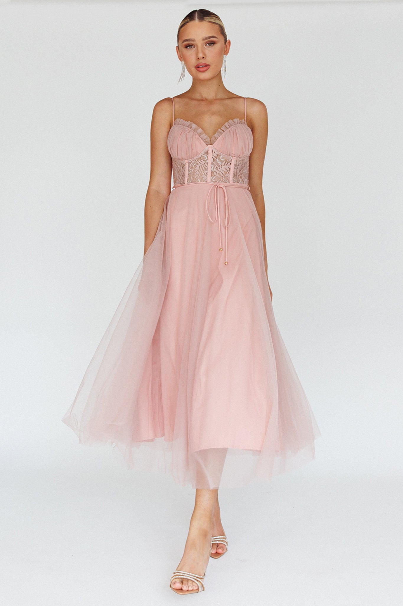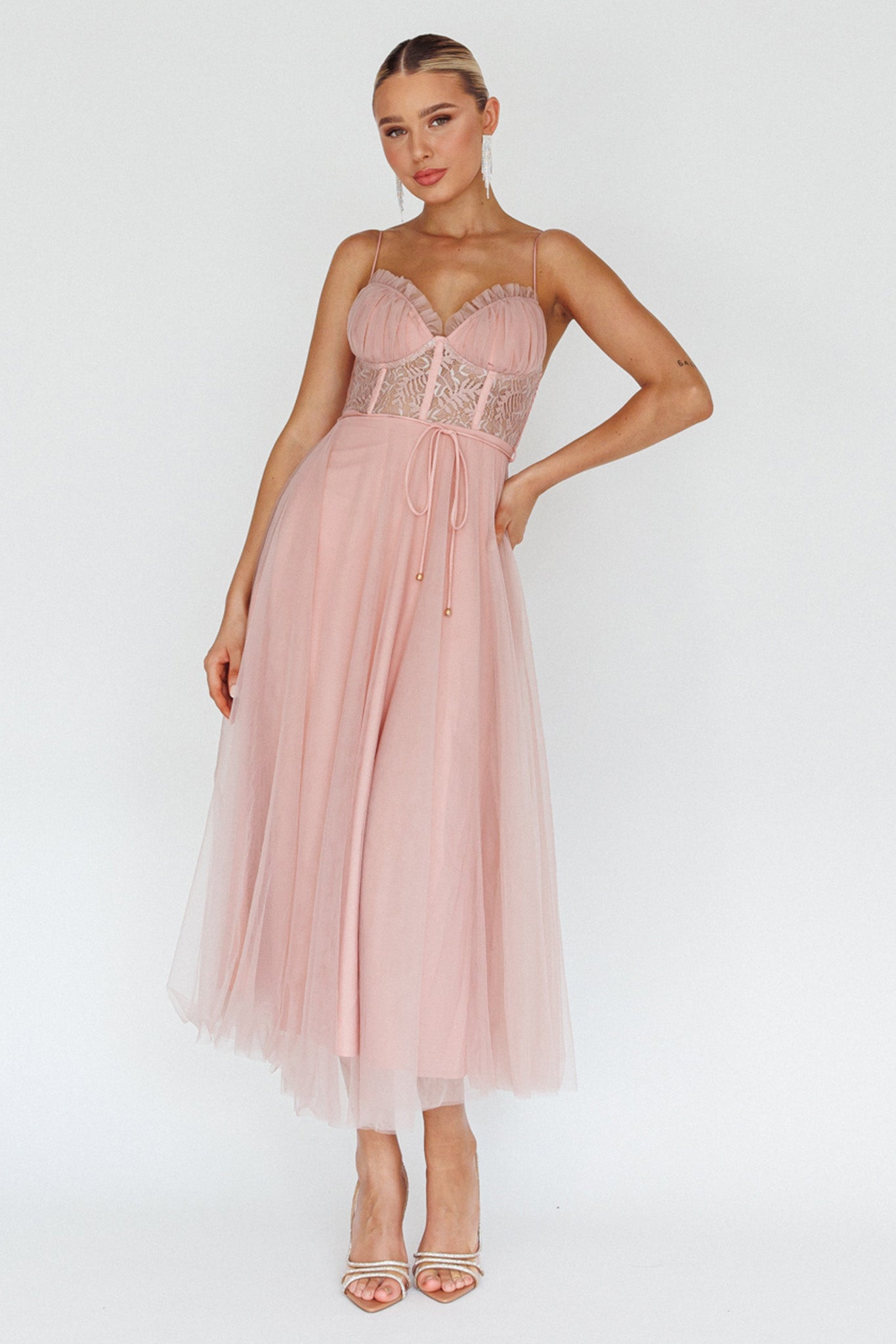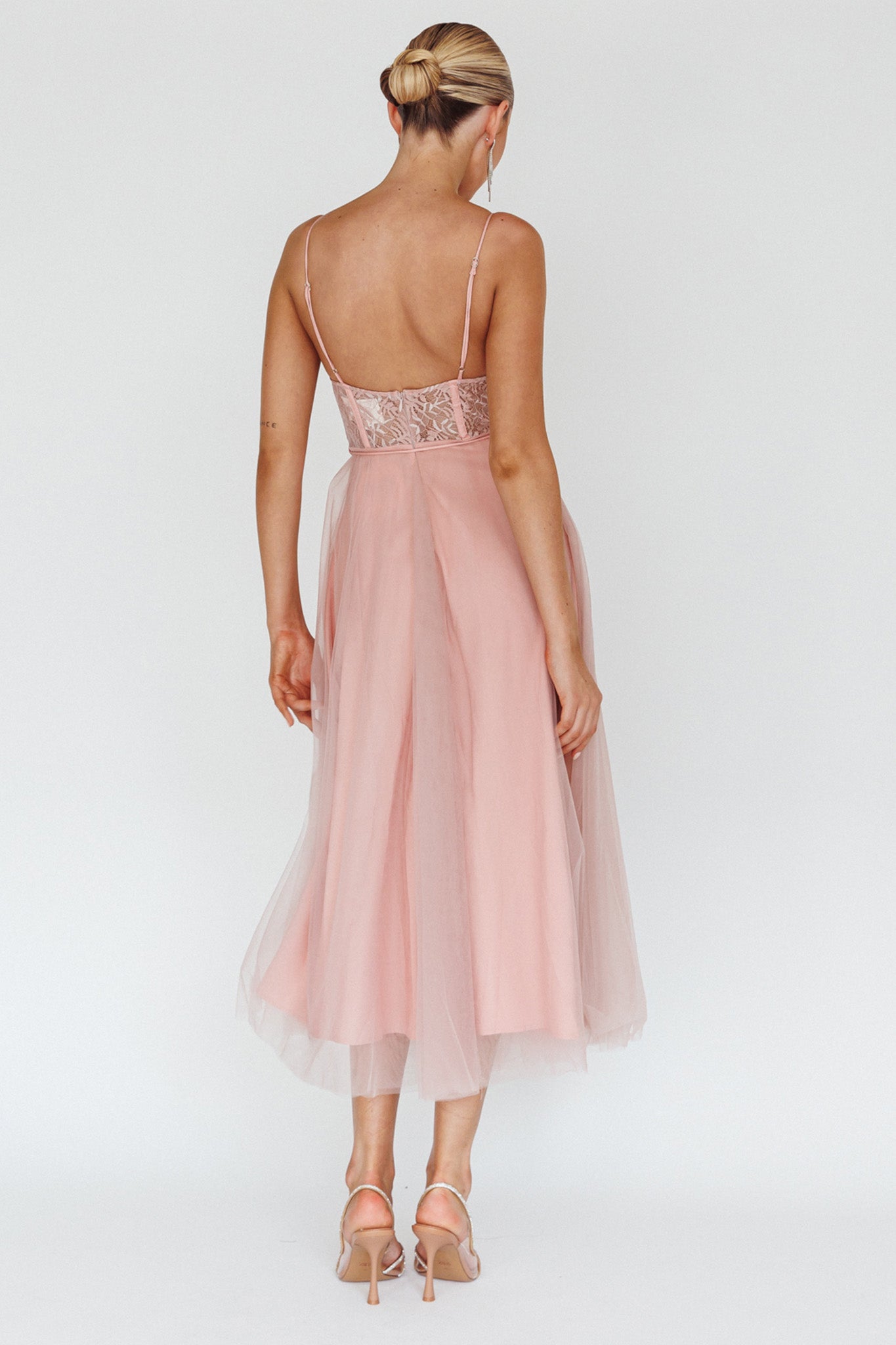 Trophy Lace Bodice Mesh Midi Dress Blush