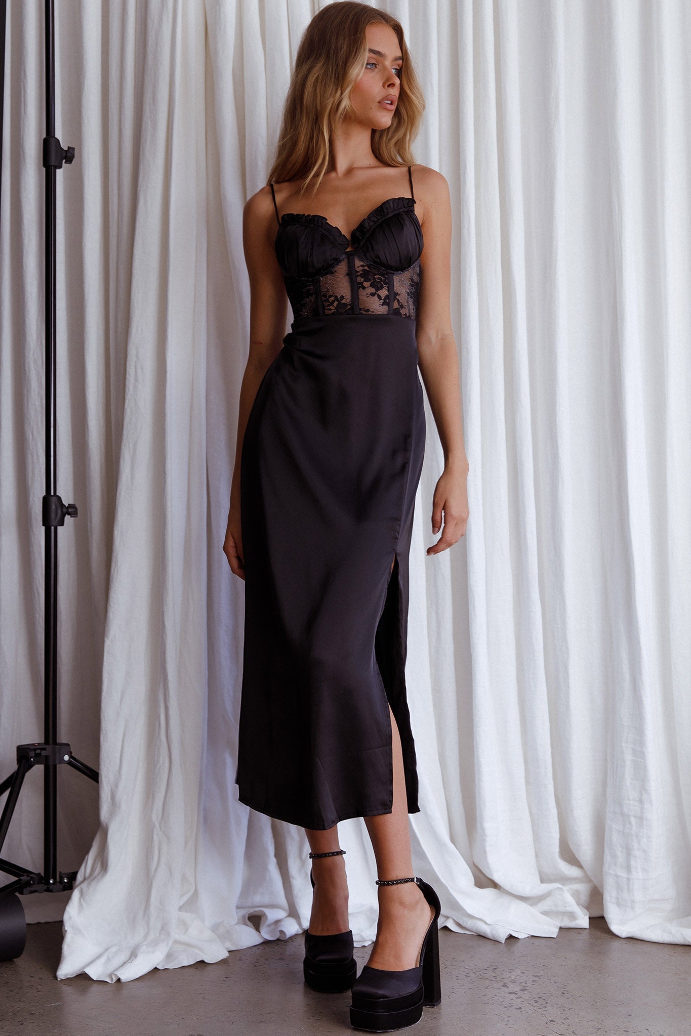Trophy Lace Bodice Midi Dress Black