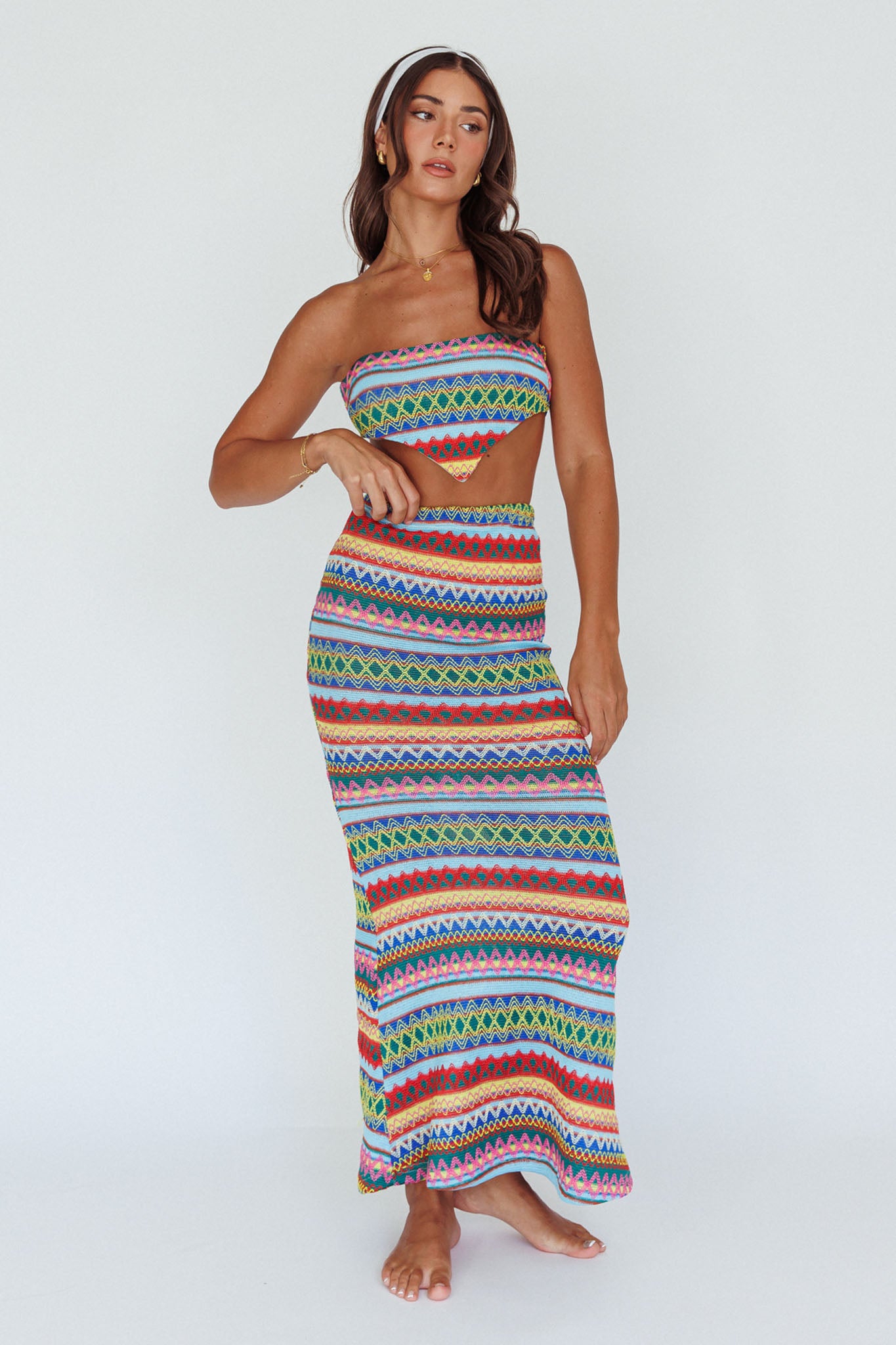 Stand out from the crowd in our super cute Tulum midi skirt. Featuring a textured, knit fabric, it's perfect for Summer cocktails with your girls. Team it with its matching crop top and sandals for a look that will turn heads.