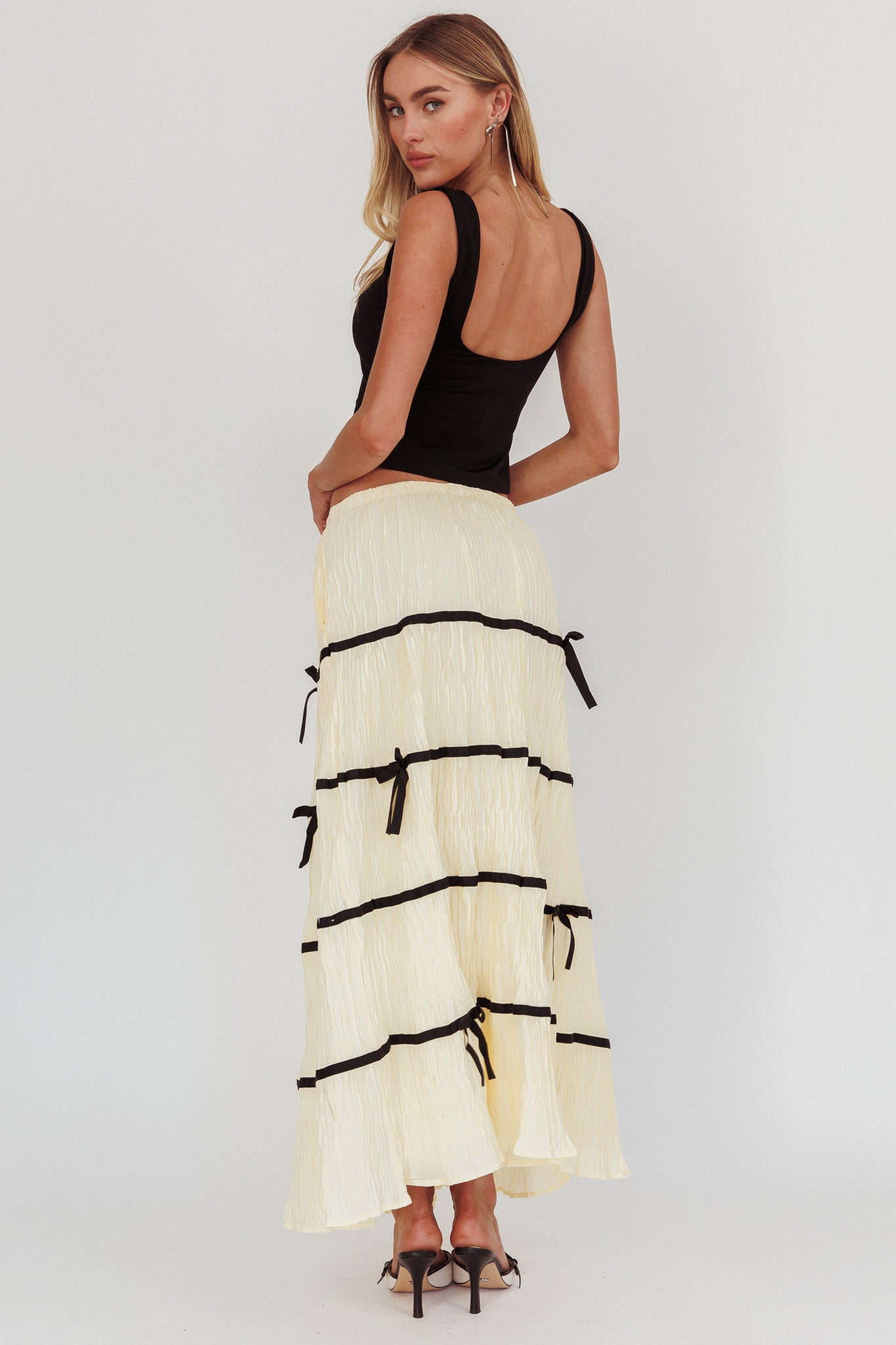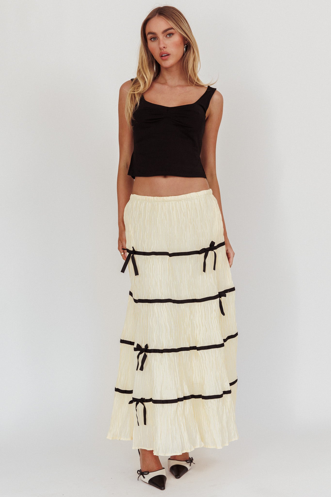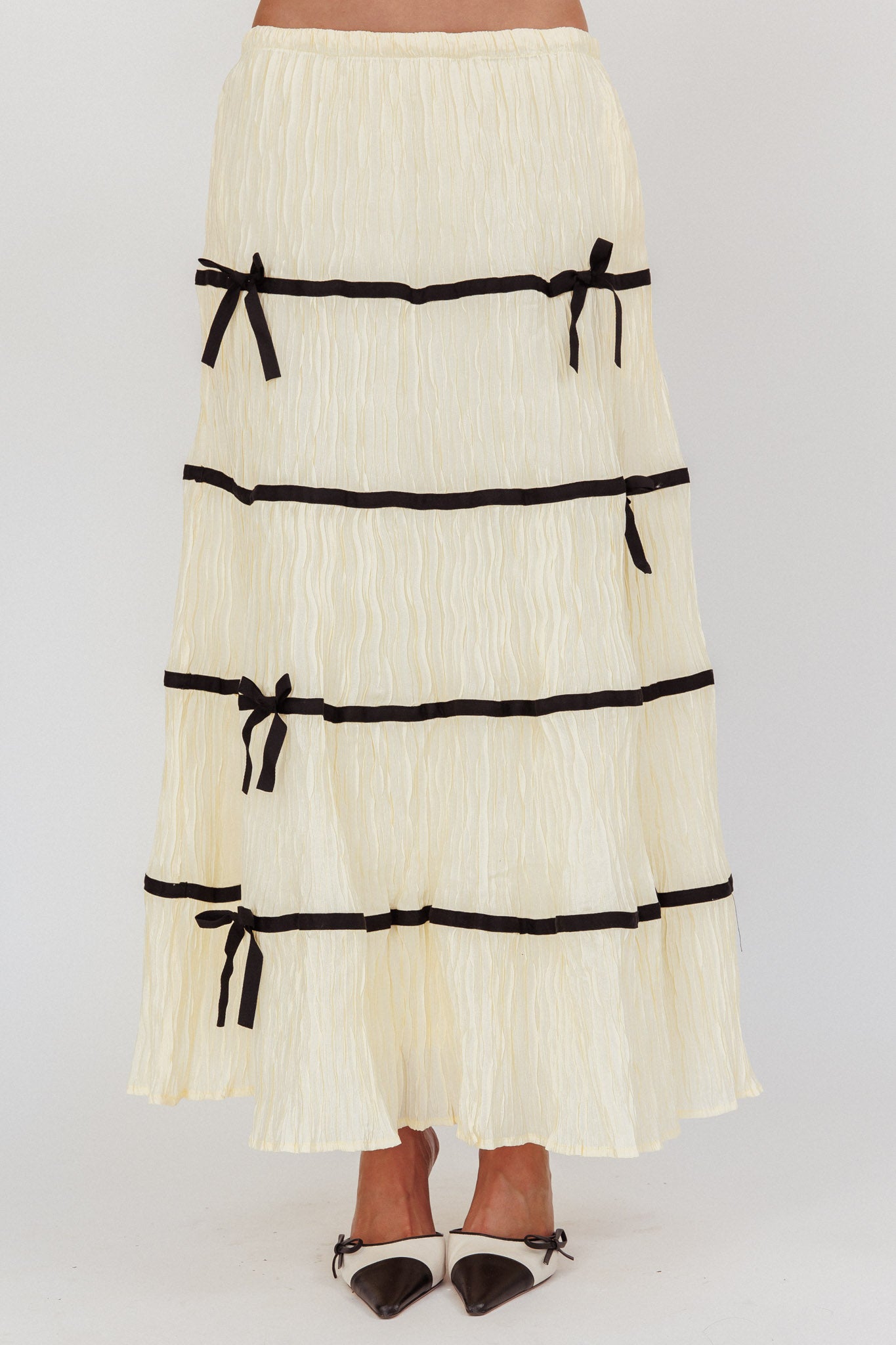 Unleash your inner trendsetter with our Tunnel Of Love maxi skirt. The a-line fit and elastic waist offers maximum comfort! The contrast bows adds a playful touch- it's perfect for those who love to push the boundaries of fashion.