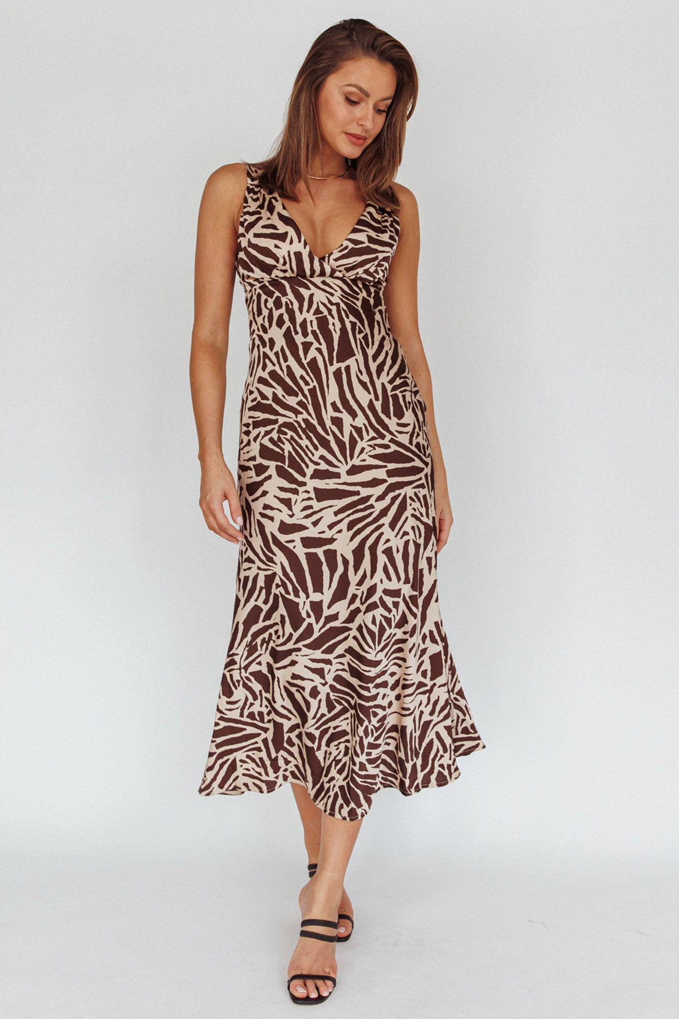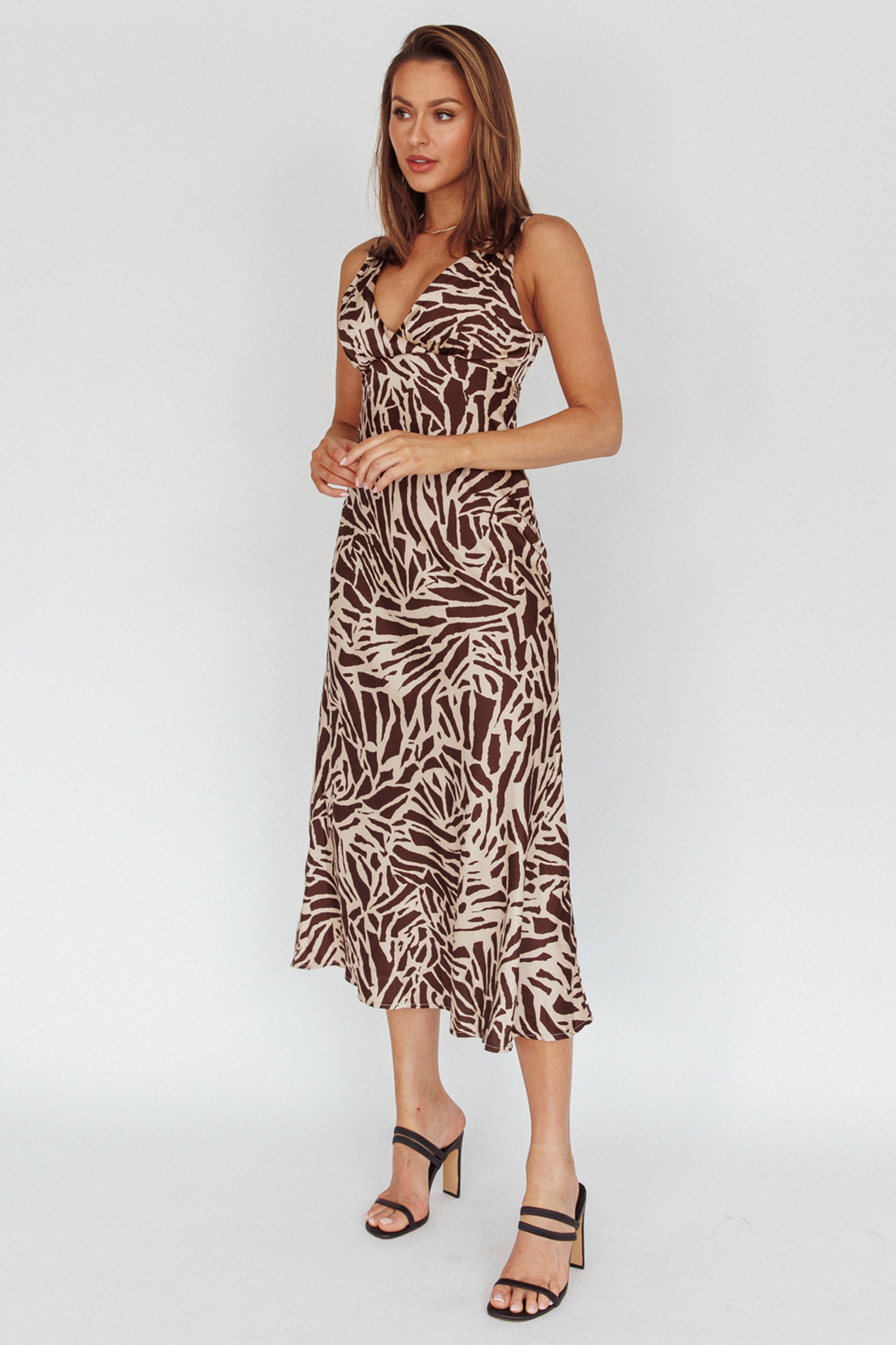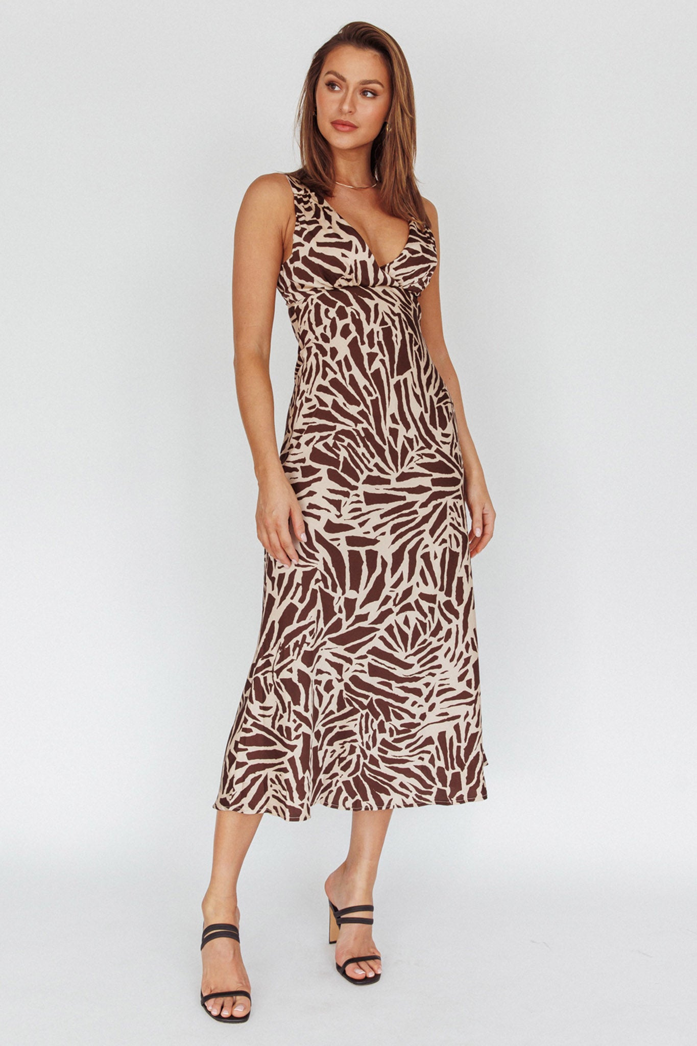 Turin V-Neckline Print Midi Dress Chocolate