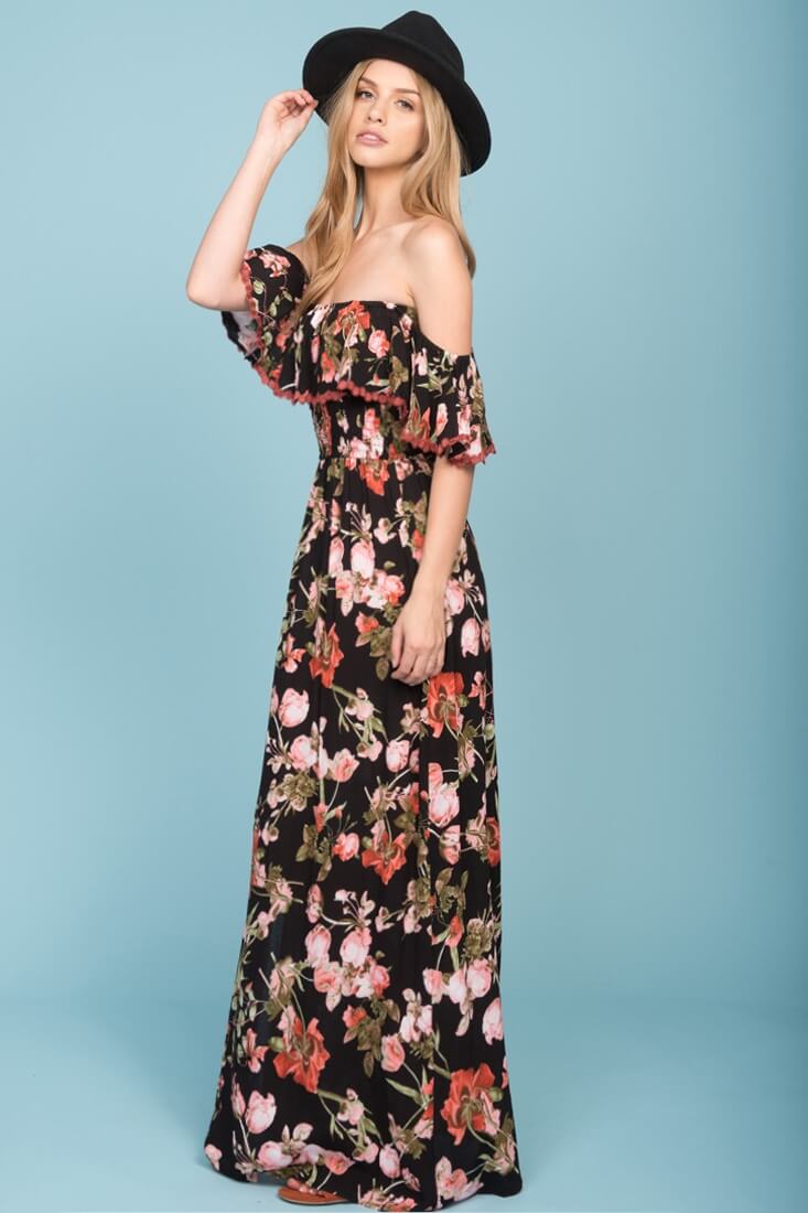 Victorian England meets Sunny California in this ruffled dream of a dress. The Tuscany Off the Shoulder Maxi Dress will keep you looking cool and beautiful at the next family or friends picnic!