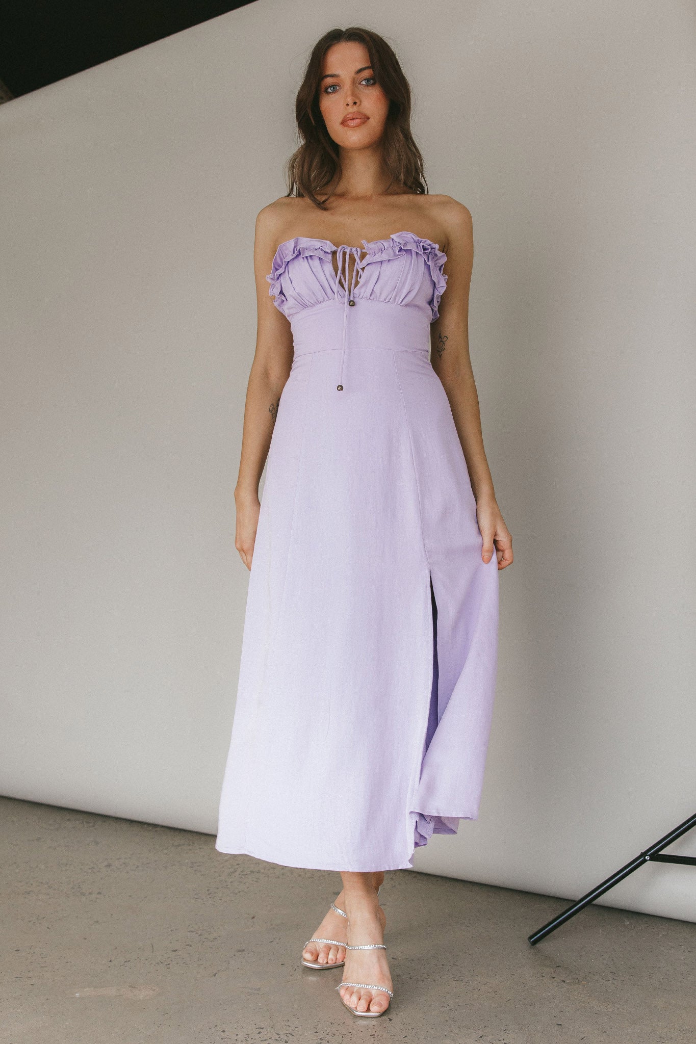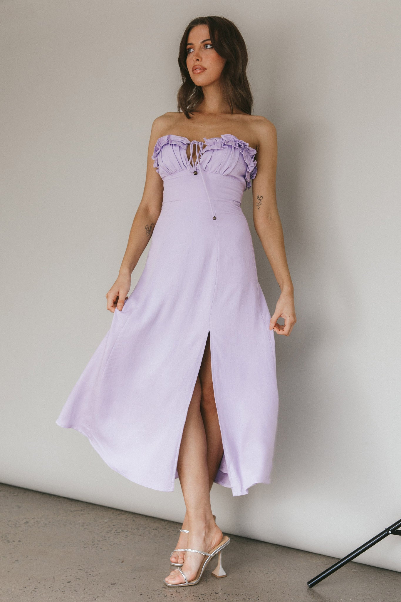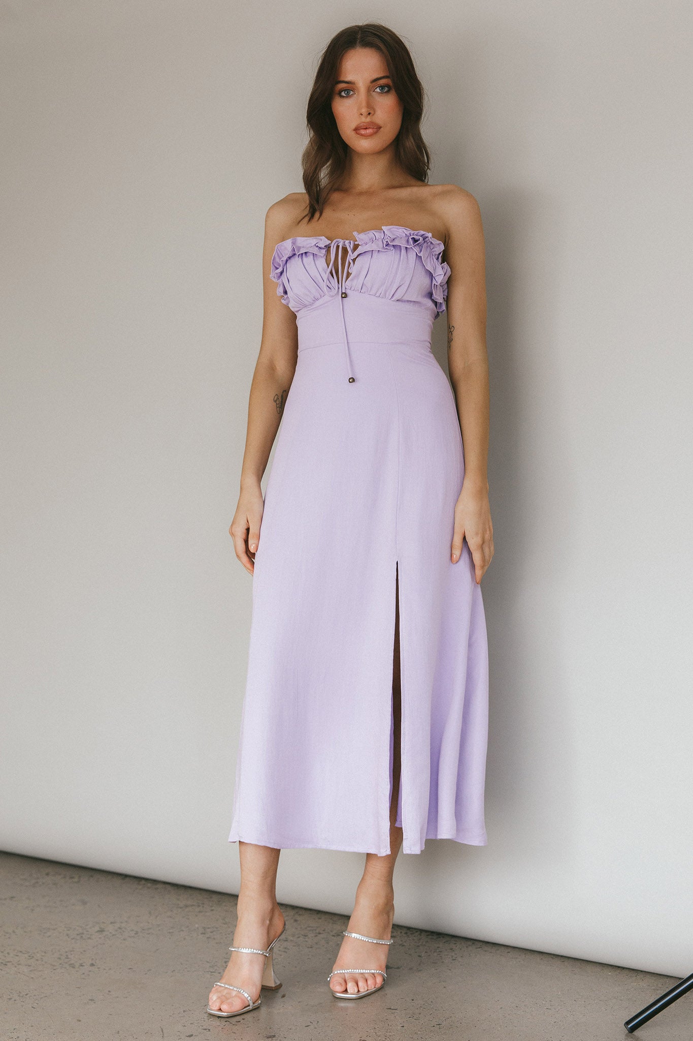 Make an entrance in our gorgeous Under The Sun midi dress. Featuring a frill-trimmed bust with tie and strapless style. Perfect for Saturday brunch dates with your bff's teamed with tan mules and a tote. Super cute!