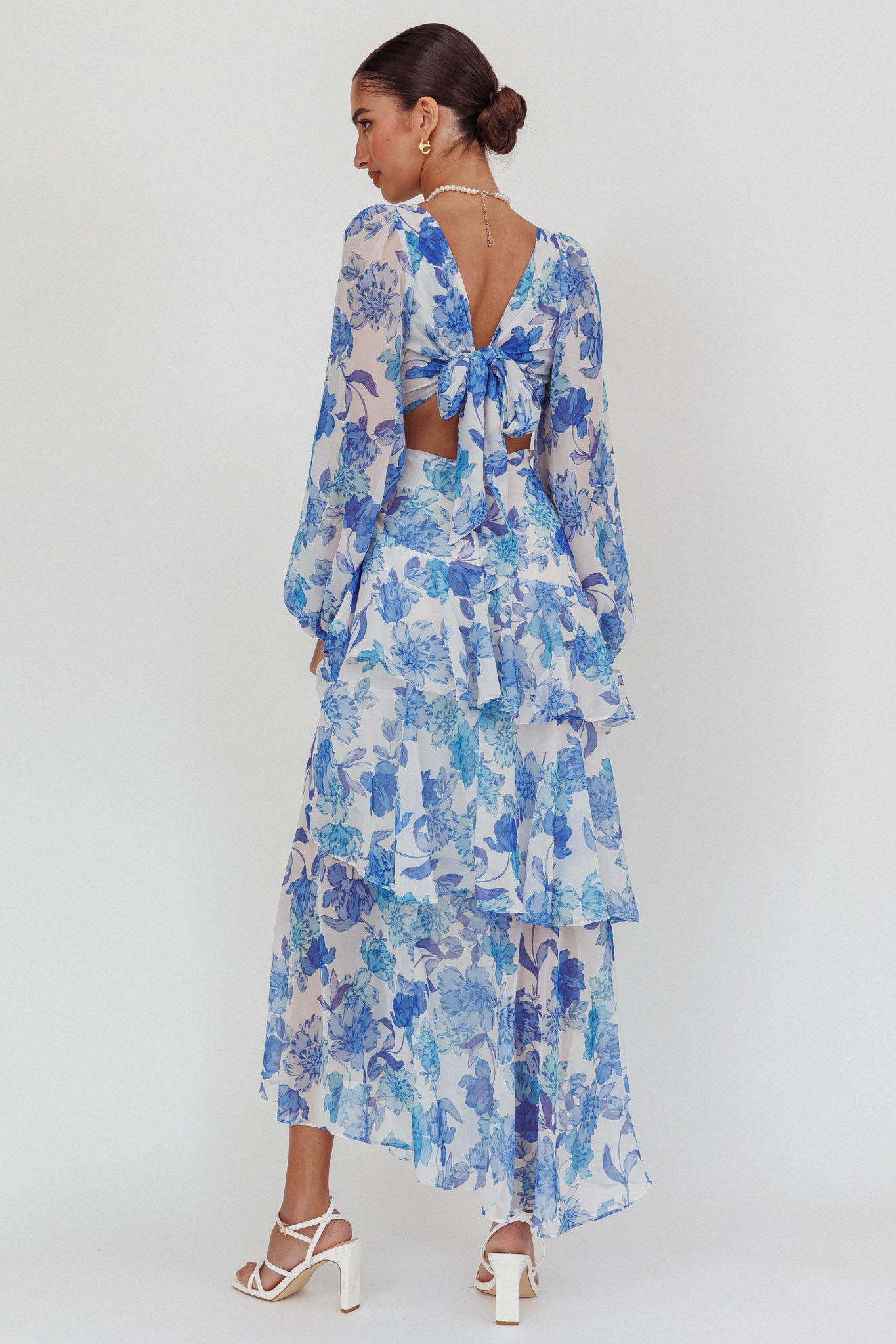 Veda Long Sleeve Floral Tiered Ruffle Maxi Dress Blue