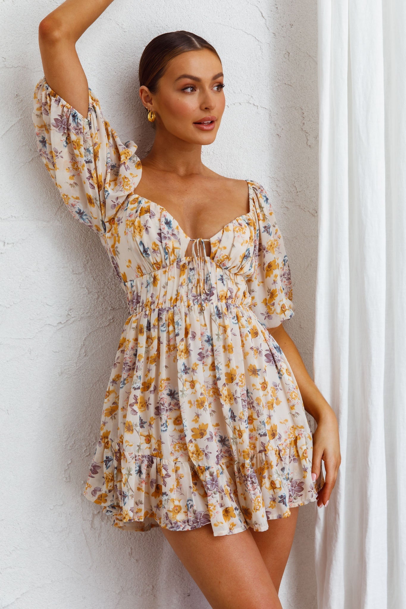 Breeze through your day in our dreamy Vista Del Mar mini dress. Featuring a floaty chiffon and string-tie detail in the bust. Perfect for weekend brunching with your girls teamed with tan mules and a tote.