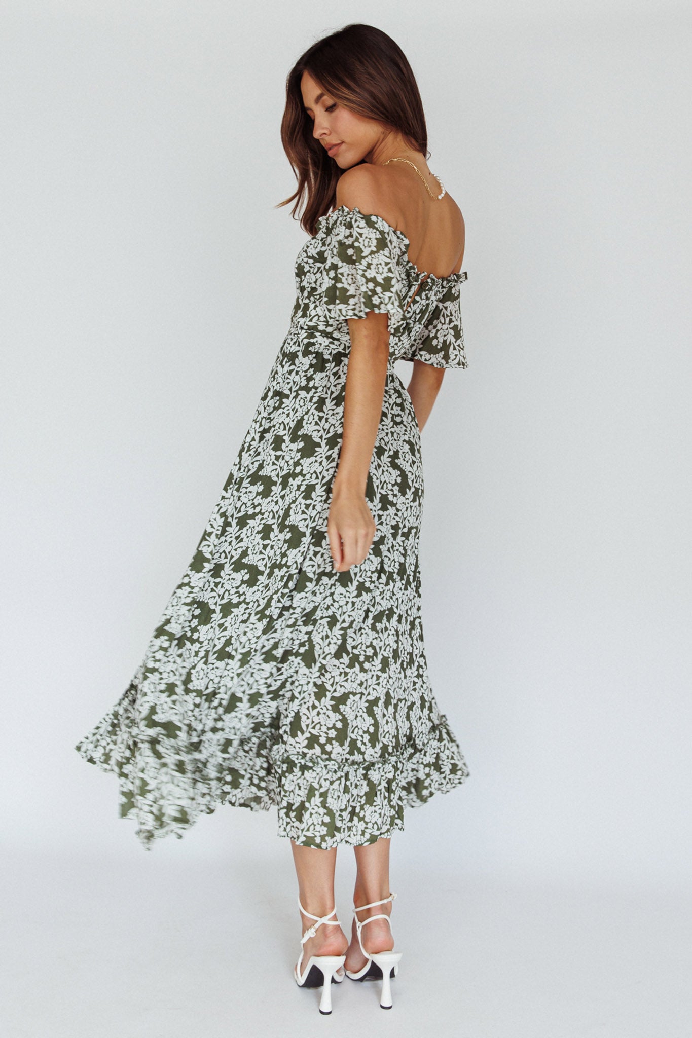 Voyager Off-Shoulder Bell Sleeve Midi Dress Floral Green