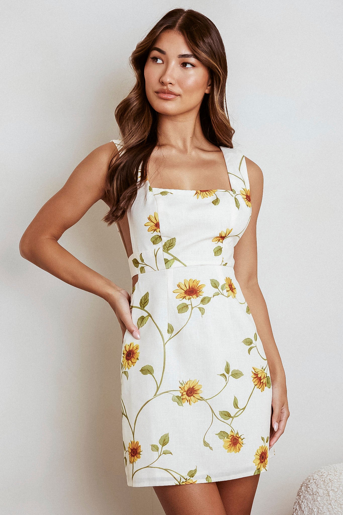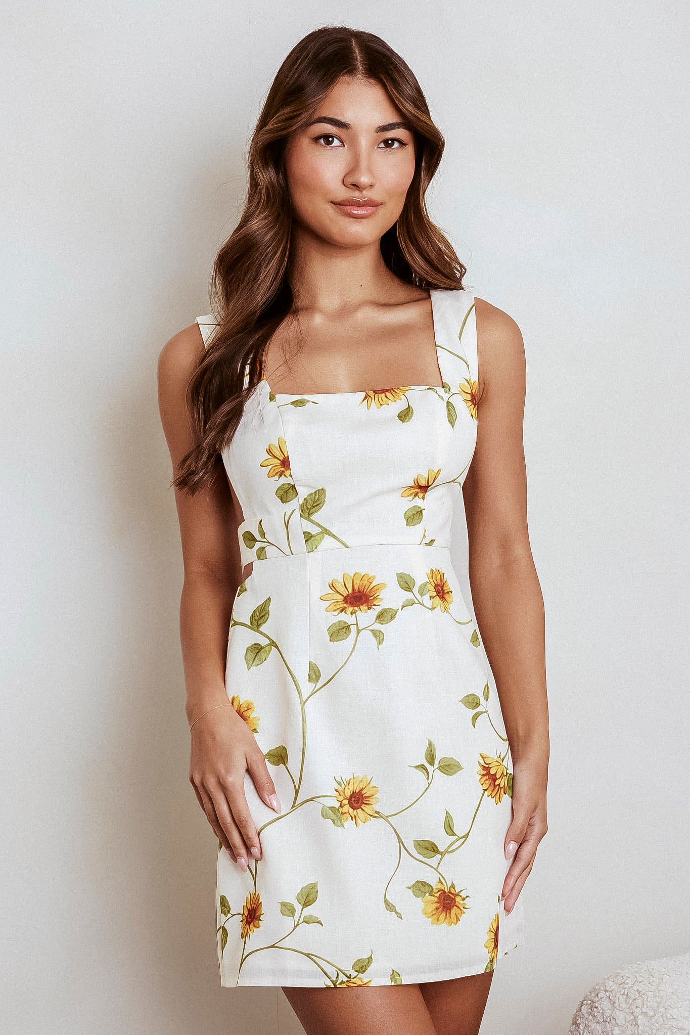 Float through the weekend in our stunning Walking On Sunshine mini dress. It features a tied back and pretty Sunflower print. It's perfect for a flirty first date teamed with slides and a tote for a super cute look.