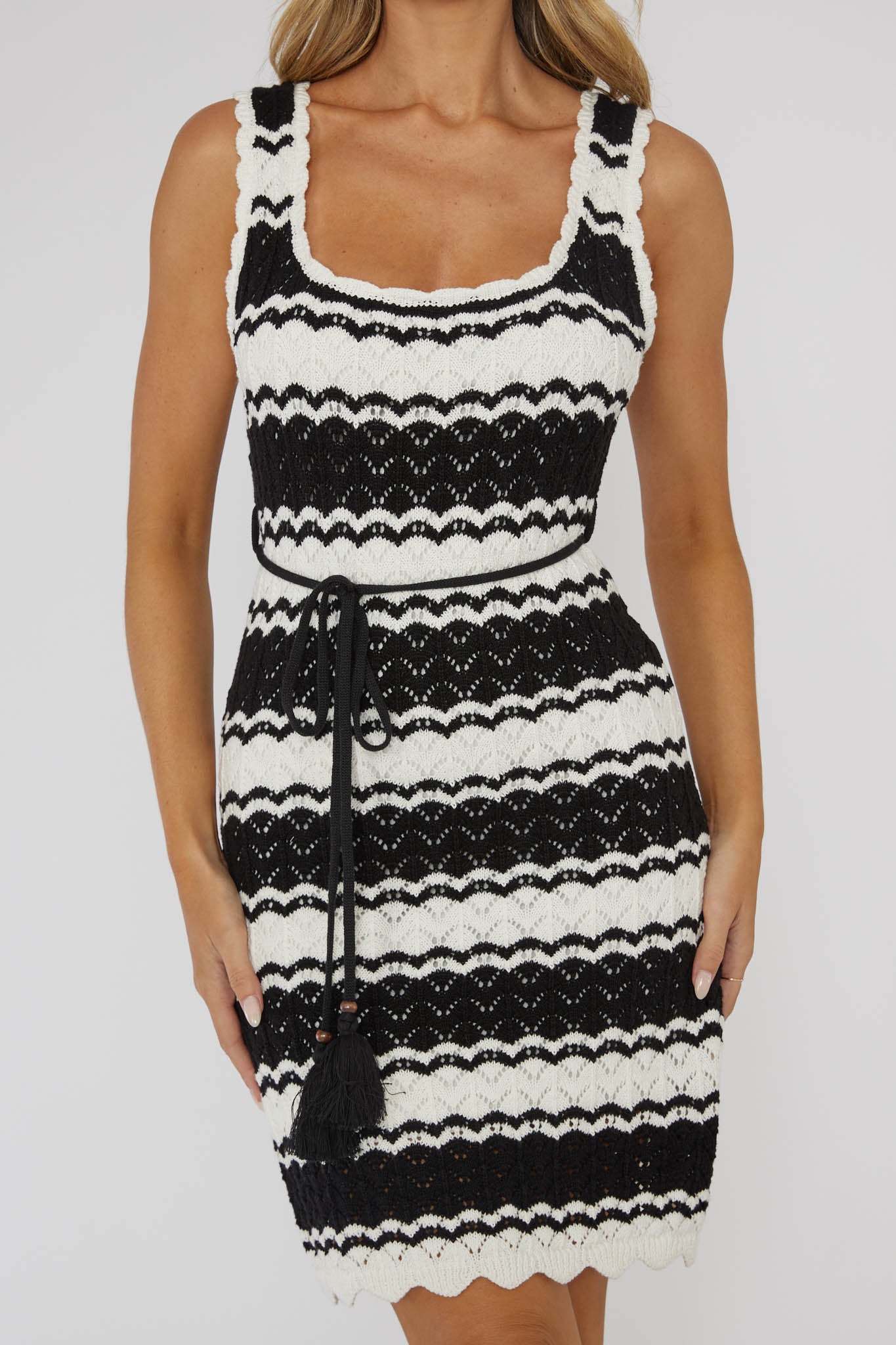 Your Summer wardrobe is calling, it needs this dress! Our Wander Lust dress features a crochet knit and string-tie around the waist. Perfect for Summer pool parties teamed with tan sandals and a slouchy, boho tote.