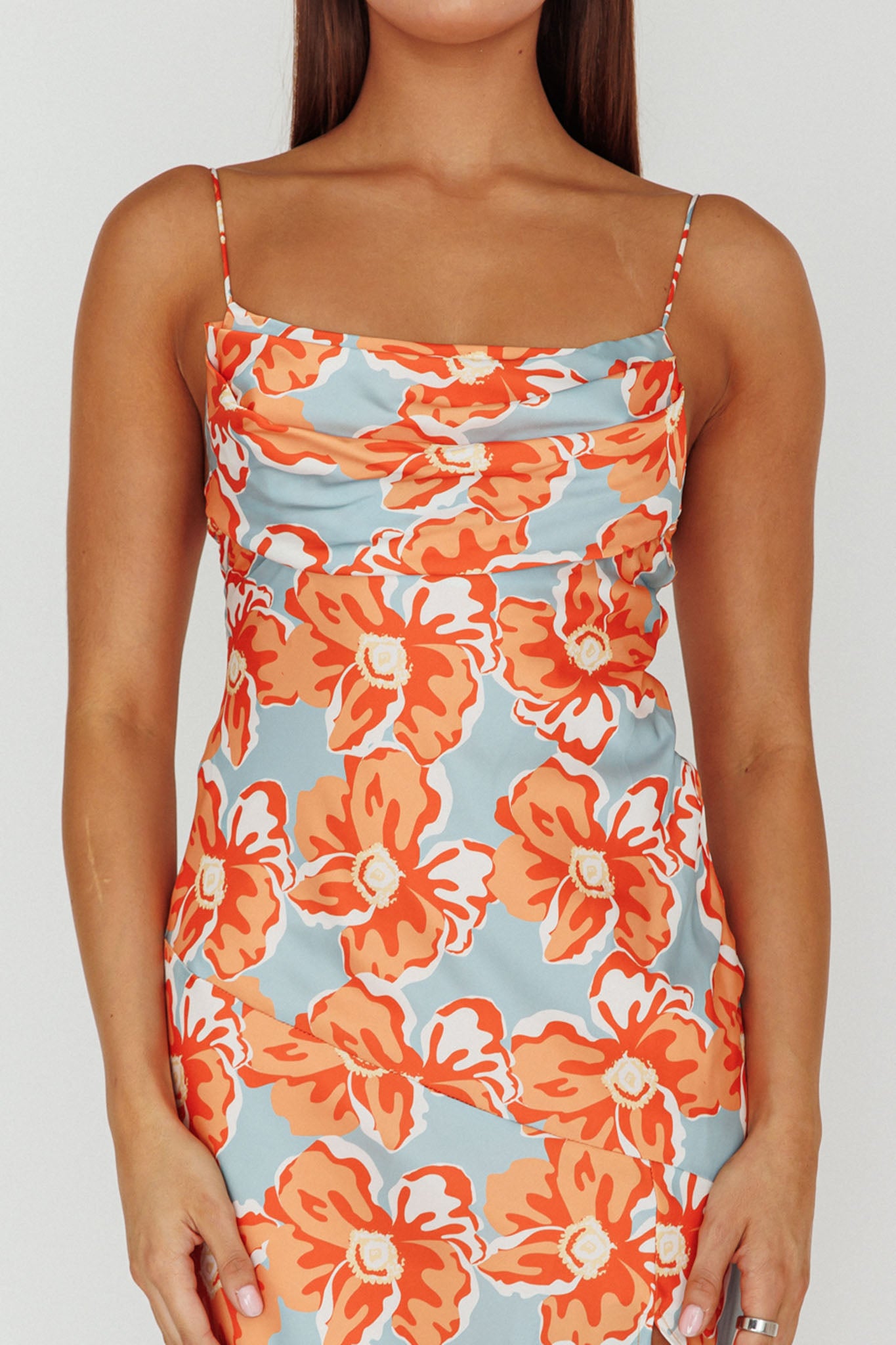 Well Versed Pleated Bust Front Split Dress Flowers Orange